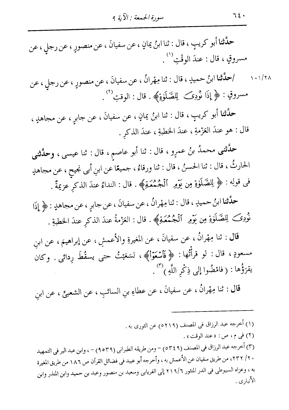 حَدَّثَنَا ابْنُ حُمَيْدٍ، قَالَ: ثنا مِهْرَانُ، عَنْ سُفْيَانَ، عَنْ جَابِرٍ، عَنْ مُجَاهِدٍ {إِذَا نُودِيَ لِلصَّلَاةِ مِنْ يَوْمِ الْجُمُعَةِ} [الجمعة: 9] قَالَ: §الْعَزْمَةُ عِنْدَ الذِّكْرِ عِنْدَ الْخُطْبَةِ