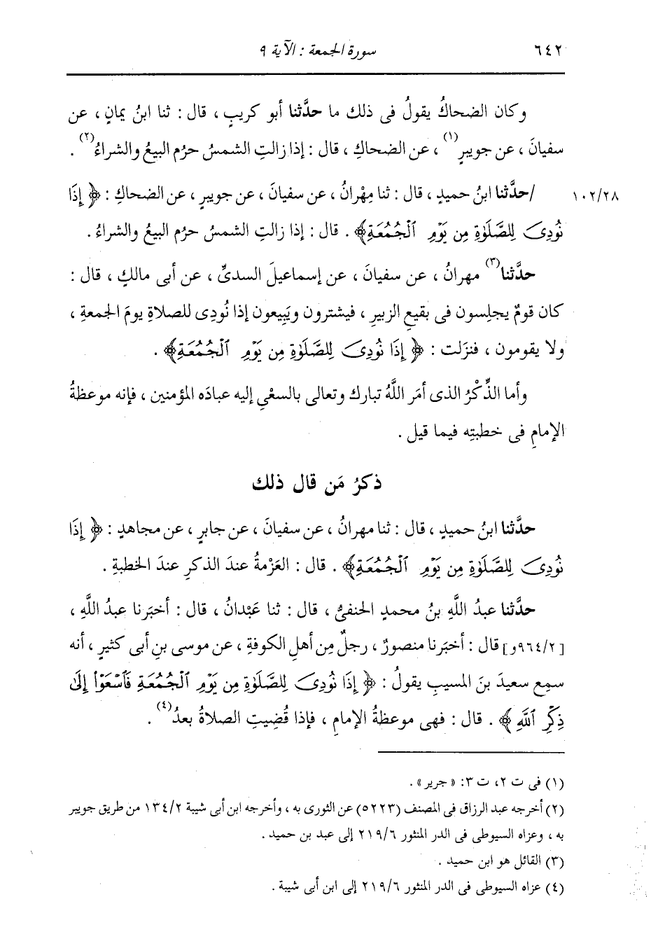 حَدَّثَنَا ابْنُ حُمَيْدٍ، قَالَ: ثنا مِهْرَانُ، عَنْ سُفْيَانَ، عَنْ جُوَيْبِرٍ، عَنِ الضَّحَّاكِ {إِذَا نُودِيَ لِلصَّلَاةِ مِنْ يَوْمِ الْجُمُعَةِ} [الجمعة: 9] قَالَ: §إِذَا زَالَتِ الشَّمْسُ حَرُمَ الْبَيْعُ وَالشِّرَاءُ