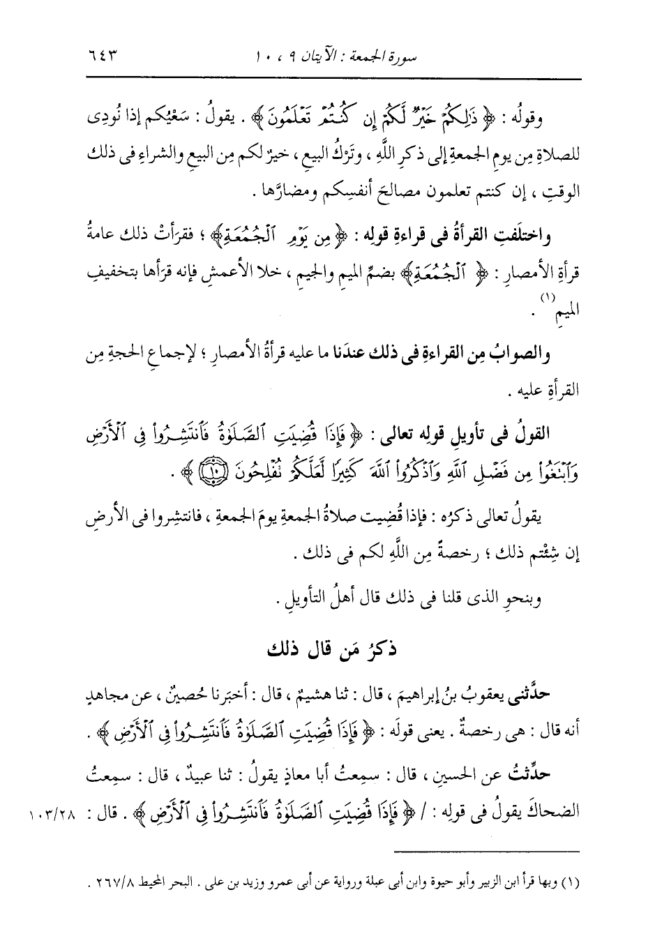 §وَقَوْلُهُ: {ذَلِكُمْ خَيْرٌ لَكُمْ إِنْ كُنْتُمْ تَعْلَمُونَ} [التوبة: 41] يَقُولُ: سَعْيُكُمْ إِذَا نُودِيَ لِلصَّلَاةِ مِنْ يَوْمِ الْجُمُعَةِ إِلَى ذِكْرِ اللَّهِ، وَتَرْكُ الْبَيْعِ خَيْرٌ لَكُمْ مِنَ الْبَيْعِ وَالشِّرَاءِ فِي ذَلِكَ الْوَقْتِ، إِنْ كُنْتُمْ تَعْلَمُونَ مَصَالِحَ أَنْفُسِكُمْ وَمَضَارَّهَا. وَاخْتَلَفَتِ الْقُرَّاءُ فِي قِرَاءَةِ قَوْلِهِ: {مِنْ يَوْمِ الْجُمُعَةِ} [الجمعة: 9] فَقَرَأَتْ ذَلِكَ عَامَّةُ قُرَّاءِ الْأَمْصَارِ: {الْجُمُعَةِ} [الجمعة: 9] بِضَمِّ الْمِيمِ وَالْجِيمِ، خَلَا الْأَعْمَشَ فَإِنَّهُ قَرَأَهَا بِتَخْفِيفِ الْمِيمِ. وَالصَّوَابُ مِنَ الْقِرَاءَةِ فِي ذَلِكَ عِنْدَنَا مَا عَلَيْهِ قُرَّاءُ الْأَمْصَارِ لِإِجْمَاعِ الْحُجَّةِ مِنَ الْقُرَّاءِ عَلَيْهِ.