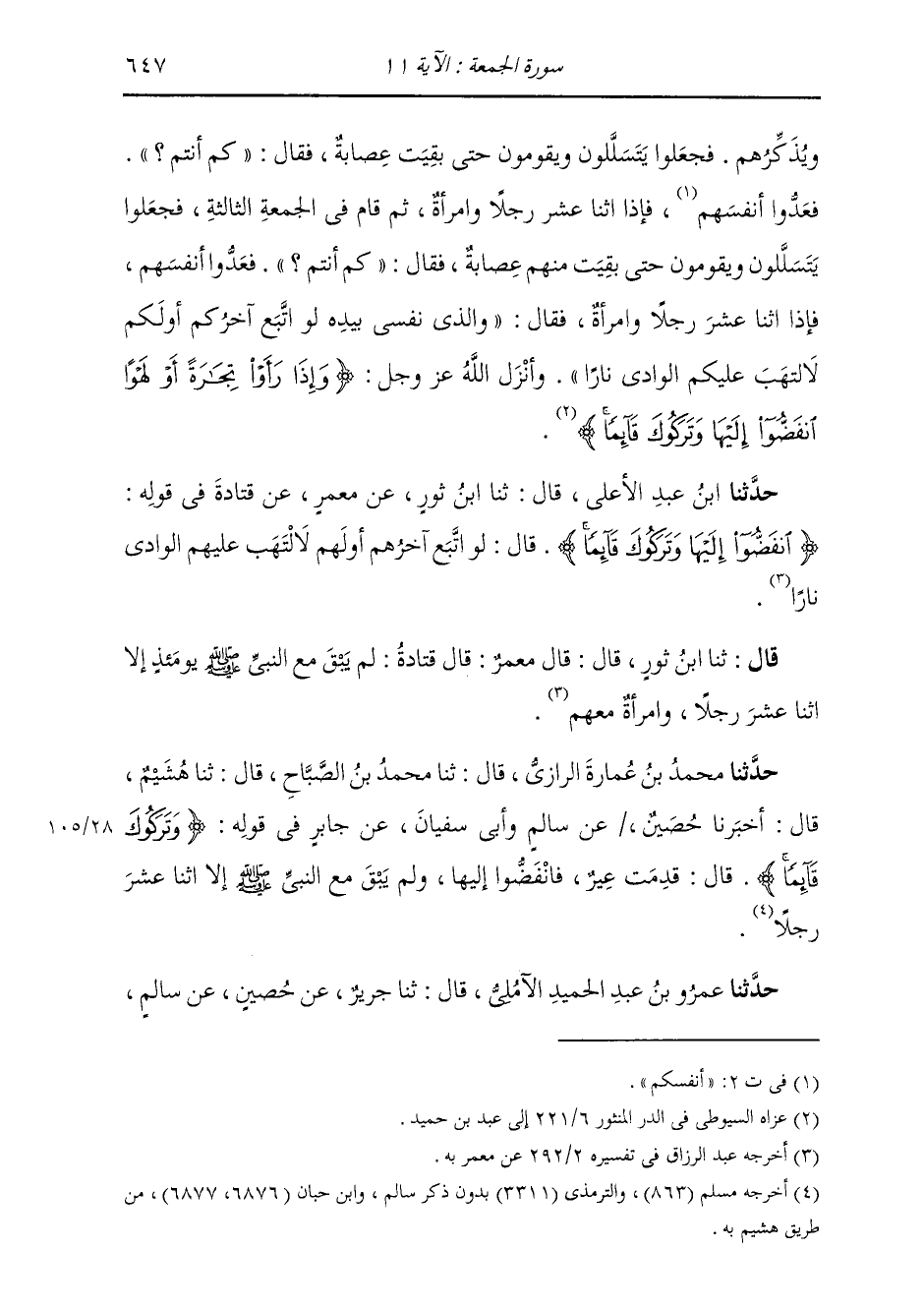 حَدَّثَنَا مُحَمَّدُ بْنُ عُمَارَةَ الرَّازِيُّ، قَالَ: ثنا مُحَمَّدُ بْنُ الصَّبَّاحِ، قَالَ: ثنا هُشَيْمٌ، قَالَ: أَخْبَرَنَا حُصَيْنٌ، عَنْ سَالِمٍ وَأَبِي سُفْيَانَ، عَنْ جَابِرٍ، فِي قَوْلِهِ: {§وَتَرَكُوكَ قَائِمًا} [الجمعة: 11] قَالَ: قَدِمَتْ عِيرٌ فَانْفَضُّوا إِلَيْهَا، وَلَمْ يَبْقَ مَعَ النَّبِيِّ صَلَّى اللهُ عَلَيْهِ وَسَلَّمَ إِلَّا اثْنَا عَشَرَ رَجُلًا