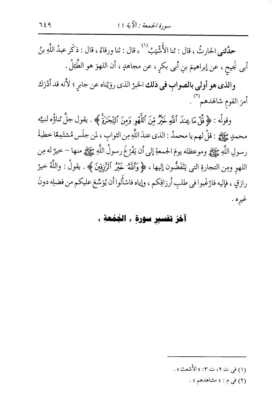 حَدَّثَنِي الْحَارِثُ، قَالَ: ثنا الْأَشْيَبُ، قَالَ: ثنا وَرْقَاءُ، قَالَ: ذَكَرَ عَبْدُ اللَّهِ بْنُ أَبِي نَجِيحٍ، عَنْ إِبْرَاهِيمَ بْنِ أَبِي بَكْرٍ، عَنْ مُجَاهِدٍ، أَنَّ §اللَّهْوَ: هُوَ الطَّبْلُ وَالَّذِي هُوَ أَوْلَى بِالصَّوَابِ فِي ذَلِكَ الْخَبَرُ الَّذِي رُوِّينَاهُ عَنْ جَابِرٍ، لِأَنَّهُ قَدْ أَدْرَكَ أَمْرَ الْقَوْمِ وَمَشَاهِدَهُمْ
