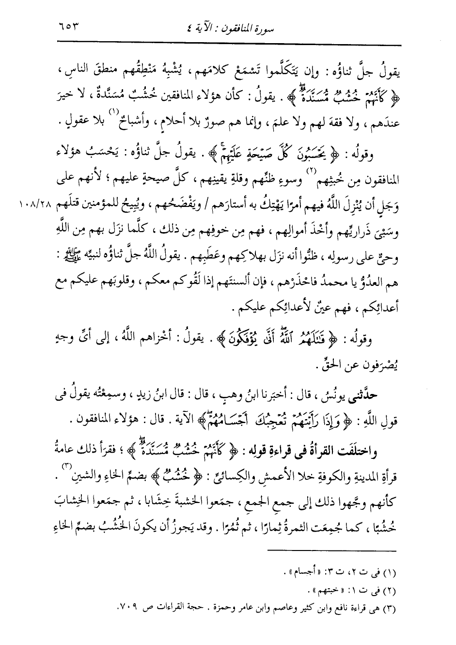 حَدَّثَنِي يُونُسُ، قَالَ: أَخْبَرَنَا ابْنُ وَهْبٍ، قَالَ: قَالَ ابْنُ زَيْدٍ، وَسَمِعْتُهُ يَقُولُ فِي قَوْلِ اللَّهِ: {§وَإِذَا رَأَيْتَهُمْ تُعْجِبُكَ أَجْسَامُهُمُ} [المنافقون: 4] الْآيَةُ، قَالَ: هَؤُلَاءِ الْمُنَافِقُونَ وَاخْتَلَفَتِ الْقُرَّاءُ فِي قِرَاءَةِ قَوْلِهِ: {كَأَنَّهُمْ خُشُبٌ مُسَنَّدَةٌ} [المنافقون: 4] فَقَرَأَ ذَلِكَ عَامَّةُ قُرَّاءِ الْمَدِينَةَ وَالْكُوفَةِ خَلَا الْأَعْمَشَ وَالْكِسَائِيَّ: {خُشُبٌ} [المنافقون: 4] بِضَمِّ الْخَاءِ وَالشِّينِ، كَأَنَّهُمْ وَجَّهُوا ذَلِكَ إِلَى جَمْعِ الْجَمْعِ، جَمَعُوا الْخَشَبَةَ خِشَابًا ثُمَّ جَمَعُوا الْخِشَابَ خُشُبًا، كَمَا جُمِعَتِ الثَّمَرَةُ ثِمَارًا، ثُمَّ ثُمُرًا. وَقَدْ يَجُوزُ أَنْ يَكُونَ الْخُشُبُ بِضَمِّ الْخَاءِ