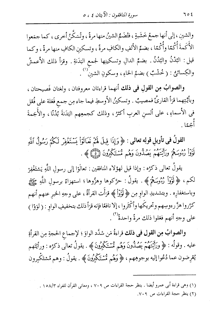 §الْقَوْلُ فِي تَأْوِيلِ قَوْلِهِ تَعَالَى: {وَإِذَا قِيلَ لَهُمْ تَعَالَوْا يَسْتَغْفِرْ لَكُمْ رَسُولُ اللَّهِ لَوَّوْا رُءُوسَهُمْ وَرَأَيْتَهُمْ يَصُدُّونَ وَهُمْ مُسْتَكْبِرُونَ} . يَقُولُ تَعَالَى ذِكْرُهُ: وَإِذَا قِيلَ لِهَؤُلَاءِ الْمُنَافِقِينَ: تَعَالَوْا إِلَى رَسُولِ اللَّهِ يَسْتَغْفِرْ لَكُمْ {لَوَّوْا رُءُوسَهُمْ} يَقُولُ: حَرَّكُوهَا وَهَزُّوهَا اسْتِهْزَاءً بِرَسُولِ اللَّهِ صَلَّى اللهُ عَلَيْهِ وَسَلَّمَ وَبِاسْتِغْفَارِهِ؛ وَبِتَشْدِيدِهَا الْوَاوَ مِنْ {لَوَّوْا} [المنافقون: 5] قَرَأَتِ الْقُرَّاءُ عَلَى وَجْهِ الْخَبَرِ عَنْهُمْ أَنَّهُمْ كَرَّرُوا هَزَّ رُءُوسِهِمْ وَتَحْرِيكِهَا، وَأَكْثَرُوا، إِلَّا نَافِعًا فَإِنَّهُ قَرَأَ ذَلِكَ بِتَخْفِيفِ الْوَاوِ: (لَوَوْا) عَلَى وَجْهِ أَنَّهُمْ فَعَلُوا ذَلِكَ مَرَّةً وَاحِدَةً. وَالصَّوَابُ مِنَ الْقَوْلِ فِي ذَلِكَ قِرَاءَةُ مَنْ شَدَّدَ الْوَاوَ لِإِجْمَاعِ الْحُجَّةِ مِنَ الْقُرَّاءِ عَلَيْهِ.
