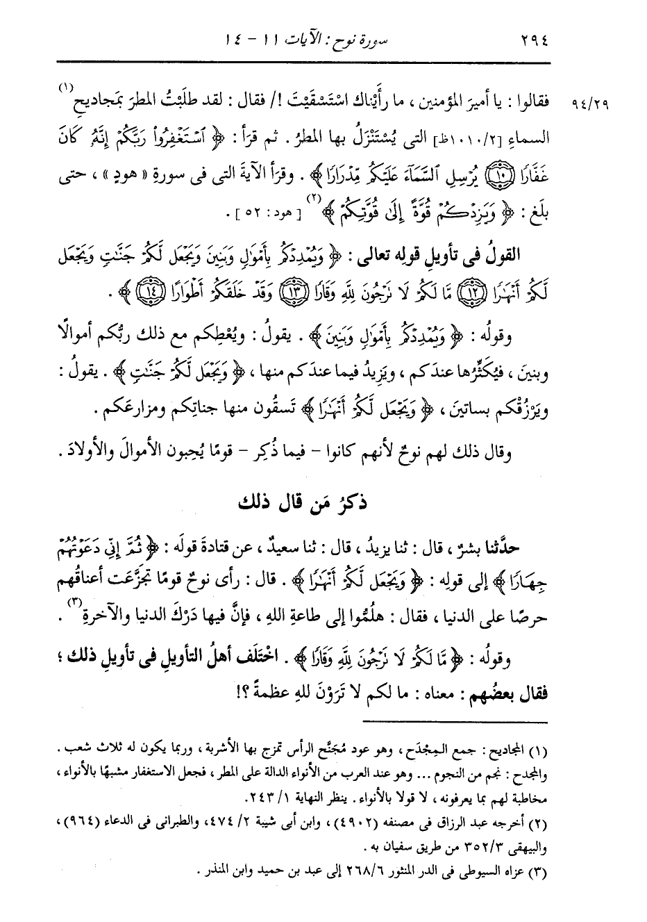 ذِكْرُ مَنْ قَالَ ذَلِكَ حَدَّثَنَا بِشْرٌ، قَالَ: ثنا يَزِيدُ، قَالَ: ثنا سَعِيدٌ، عَنْ قَتَادَةَ، قَوْلُهُ: {ثُمَّ إِنِّي دَعَوْتُهُمْ جِهَارًا} [نوح: 8] إِلَى قَوْلِهِ: {وَيَجْعَلْ لَكُمْ أَنْهَارًا} [نوح: 12] قَالَ: §رَأَى نُوحٌ قَوْمًا تَجَزَّعَتْ أَعْنَاقُهُمْ حِرْصًا عَلَى الدُّنْيَا، فَقَالَ: هَلُمُّوا إِلَى طَاعَةِ اللَّهِ، فَإِنَّ فِيهَا دَرْكُ الدُّنْيَا وَالْآخِرَةِ