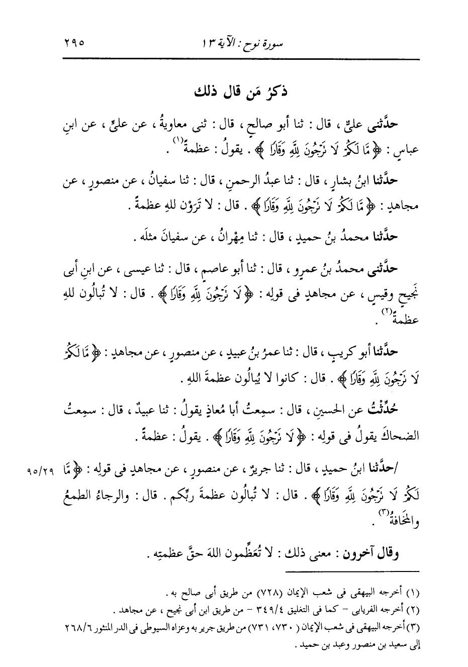 حَدَّثَنَا ابْنُ بَشَّارٍ، قَالَ: ثنا عَبْدُ الرَّحْمَنِ، قَالَ: ثنا سُفْيَانُ، عَنْ مَنْصُورٍ، عَنْ مُجَاهِدٍ، {§مَا لَكُمْ لَا تَرْجُونَ لِلَّهِ وَقَارًا} [نوح: 13] قَالَ: لَا تَرَوْنَ لِلَّهِ عَظَمَةً. حَدَّثَنَا مُحَمَّدُ بْنُ حُمَيْدٍ، قَالَ: ثنا مِهْرَانُ، عَنْ سُفْيَانَ، مِثْلَهُ