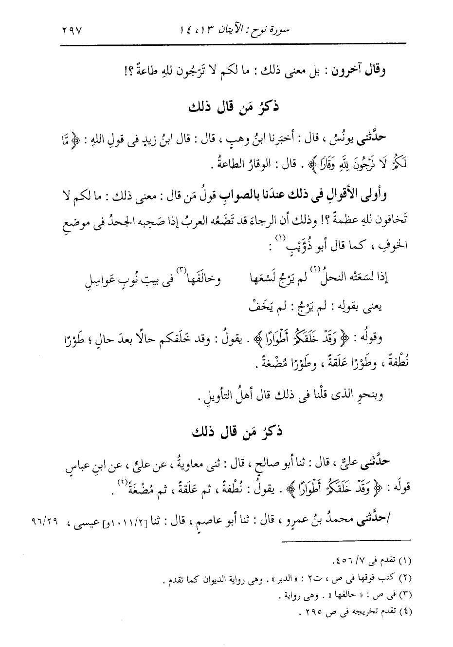 ذِكْرُ مَنْ قَالَ ذَلِكَ حَدَّثَنِي عَلِيٌّ، قَالَ: ثنا أَبُو صَالِحٍ، قَالَ: ثني مُعَاوِيَةُ، عَنْ عَلِيٍّ، عَنِ ابْنِ عَبَّاسٍ، قَوْلُهُ: {§وَقَدْ خَلَقَكُمْ أَطْوَارًا} [نوح: 14] يَقُولُ: نُطْفَةً، ثُمَّ عَلَقَةً، ثُمَّ مُضْغَةً