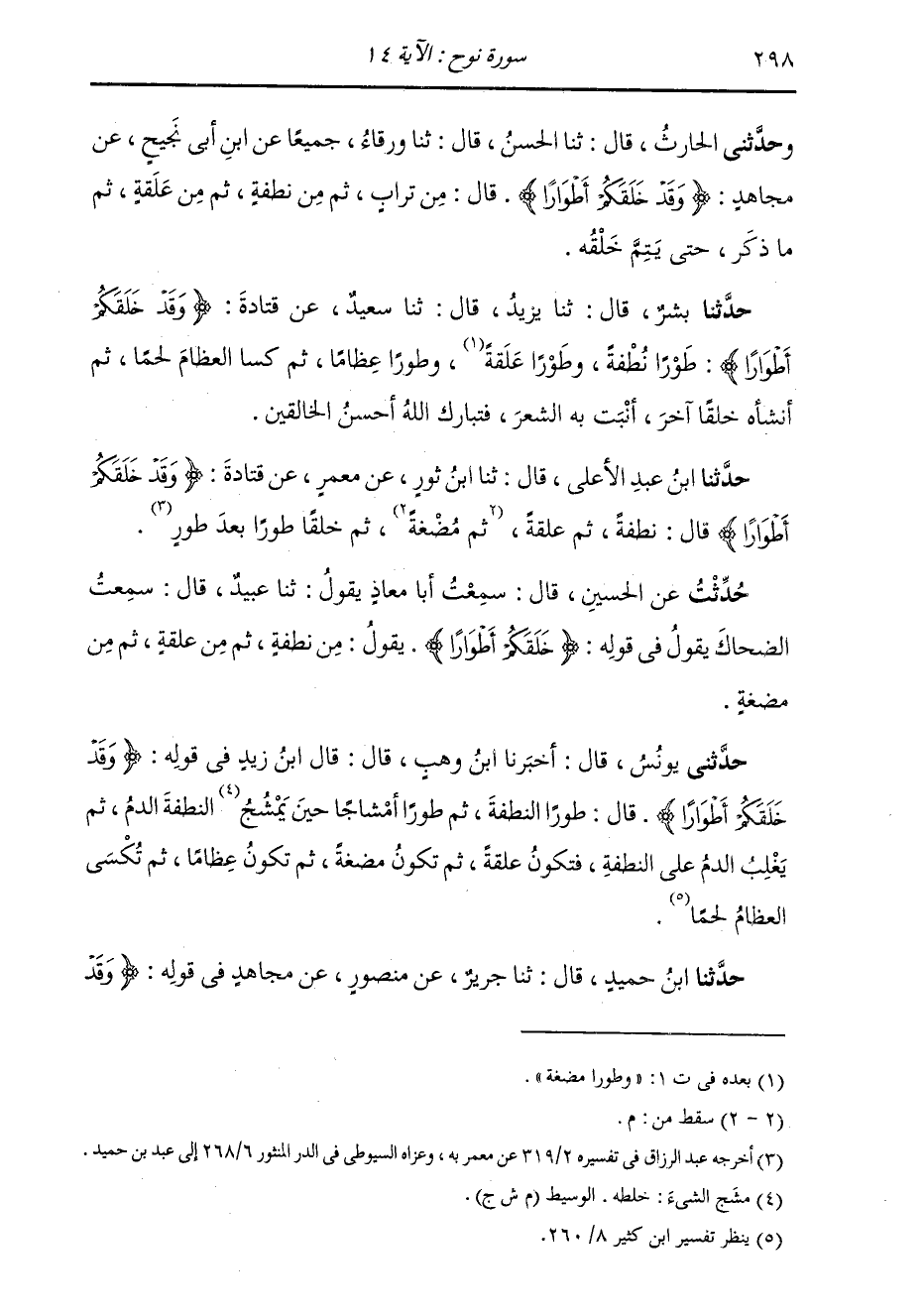حَدَّثَنَا ابْنُ حُمَيْدٍ، قَالَ: ثنا جَرِيرٌ، عَنْ مَنْصُورٍ، عَنْ مُجَاهِدٍ، فِي قَوْلِهِ: {§وَقَدْ -[299]- خَلَقَكُمْ أَطْوَارًا} [نوح: 14] قَالَ: نُطْفَةً، ثُمَّ عَلَقَةً، شَيْئًا بَعْدَ شَيْءٍ