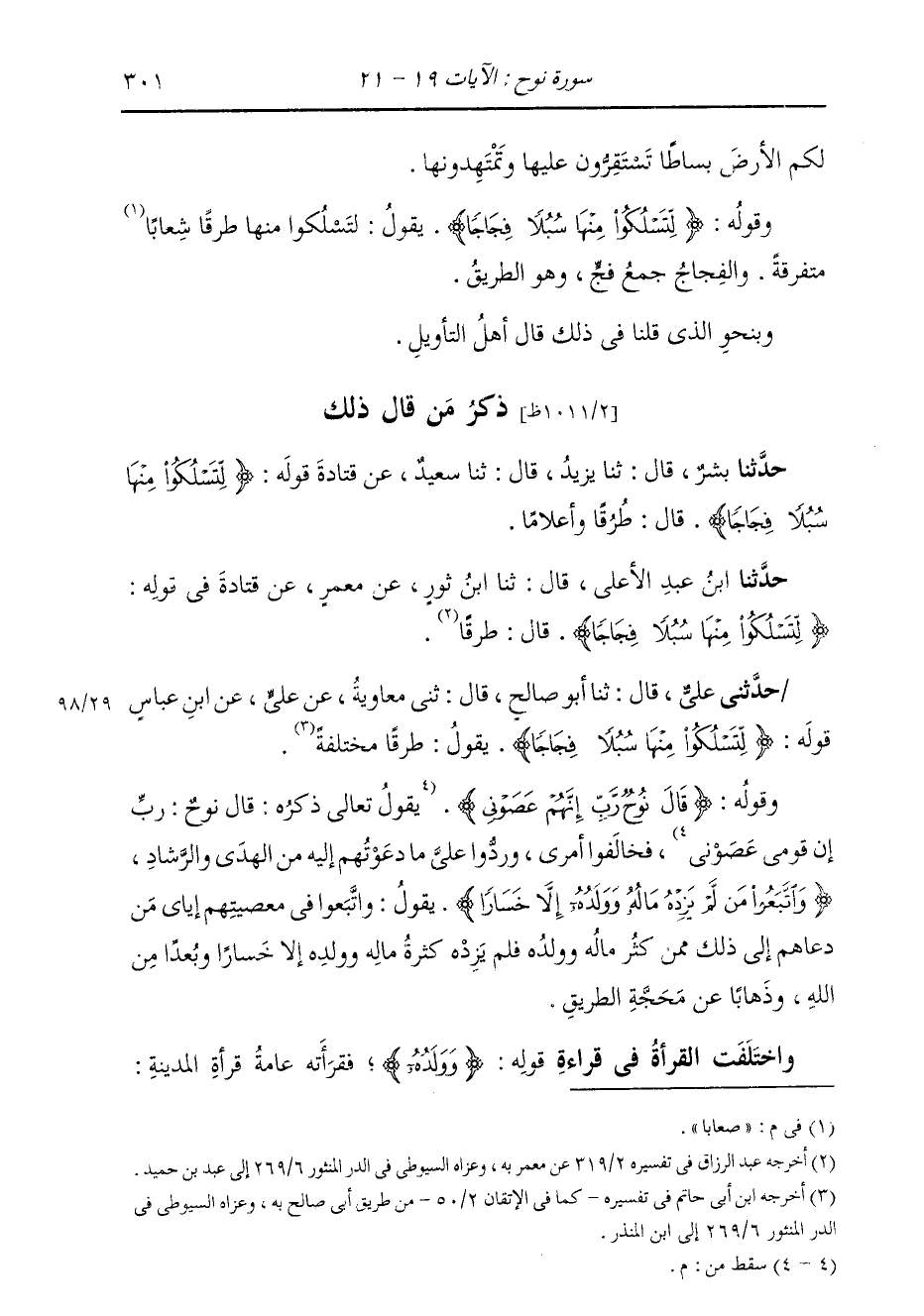 ذِكْرُ مَنْ قَالَ ذَلِكَ حَدَّثَنَا بِشْرٌ، قَالَ: ثنا يَزِيدُ، قَالَ: ثنا سَعِيدٌ، عَنْ قَتَادَةَ، {§لِتَسْلُكُوا مِنْهَا سُبُلًا فِجَاجًا} [نوح: 20] قَالَ: طُرُقًا وَأَعْلَامًا