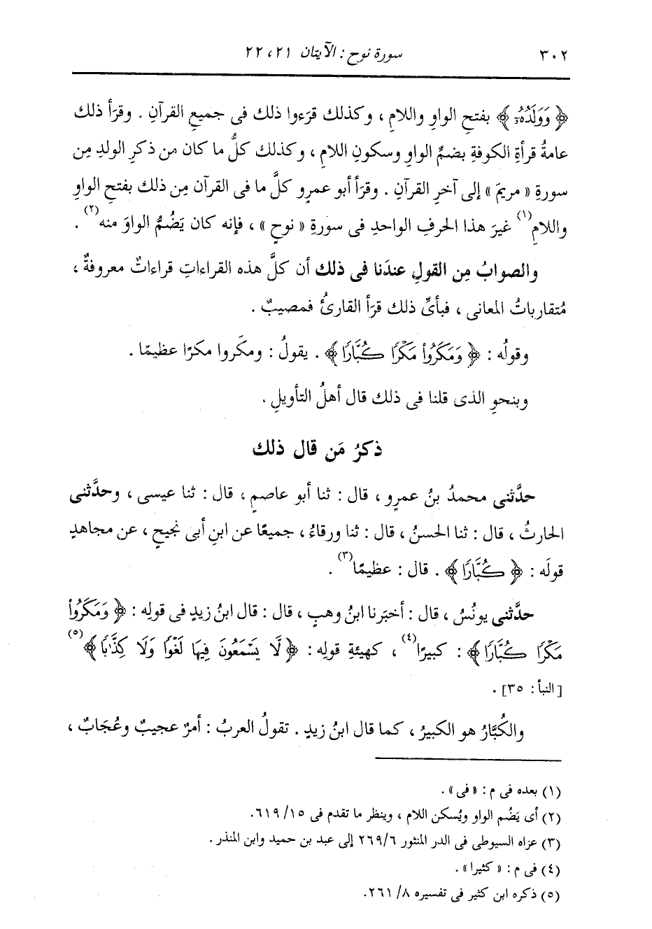 حَدَّثَنِي يُونُسُ، قَالَ: أَخْبَرَنَا ابْنُ وَهْبٍ، قَالَ: قَالَ ابْنُ زَيْدٍ، فِي قَوْلِهِ: {§وَمَكَرُوا مَكْرًا كُبَّارًا} [نوح: 22] كَثِيرًا، كَهَيْئَةِ قَوْلِهِ: {لَا يَسْمَعُونَ فِيهَا لَغْوًا} [النبأ: 35] وَلَا كِذَّابًا وَالْكُبَّارُ: هُوَ الْكَبِيرُ، كَمَا قَالَ ابْنُ زَيْدٍ، تَقُولُ الْعَرَبُ: أَمْرٌ عَجِيبٌ وَعُجَابٌ -[303]- بِالتَّخْفِيفِ، وَعُجَّابٌ بِالتَّشْدِيدِ؛ وَرَجُلٌ حُسَانٌ وَحَسَّانٌ، وَجُمَالٌ وَجُمَّالٌ بِالتَّخْفِيفِ وَالتَّشْدِيدِ، وَكَذَلِكَ كَبِيرٌ وَكُبَّارٌ بِالتَّخْفِيفِ وَالتَّشْدِيدِ