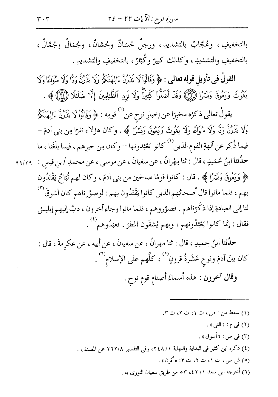 §الْقَوْلُ فِي تَأْوِيلِ قَوْلِهِ تَعَالَى {وَقَالُوا لَا تَذَرُنَّ آلِهَتَكُمْ وَلَا تَذَرُنَّ وَدًّا وَلَا سُوَاعًا وَلَا يَغُوثَ وَيَعُوقَ وَنَسْرًا وَقَدْ أَضَلُّوا كَثِيرًا وَلَا تَزِدِ الظَّالِمِينَ إِلَّا ضَلَالًا} [نوح: 24] يَقُولُ تَعَالَى ذِكْرُهُ مُخْبِرًا عَنْ إِخْبَارِ نُوحٍ، عَنْ قَوْمِهِ: {وَقَالُوا لَا تَذَرُنَّ آلِهَتَكُمْ وَلَا تَذَرُنَّ وَدًّا وَلَا سُوَاعًا وَلَا يَغُوثَ وَيَعُوقَ وَنَسْرًا} [نوح: 23] كَانَ هَؤُلَاءِ نَفَرًا مِنْ بَنِي آدَمَ فِيمَا ذُكِرَ عَنْ آلِهَةِ الْقَوْمِ الَّتِي كَانُوا يَعْبُدُونَهَا.