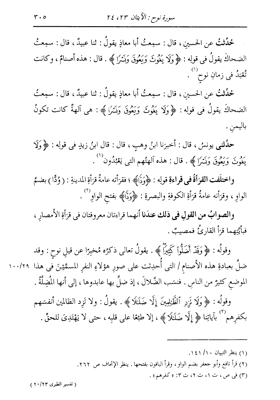 حَدَّثَنِي يُونُسُ، قَالَ: أَخْبَرَنَا ابْنُ وَهْبٍ، قَالَ: قَالَ ابْنُ زَيْدٍ، فِي قَوْلِهِ: {§وَلَا يَغُوثَ وَيَعُوقَ وَنَسْرًا} [نوح: 23] قَالَ: هَذِهِ آلِهَتُهُمُ الَّتِي يَعْبُدُونَ وَاخْتَلَفَتِ الْقُرَّاءُ فِي قِرَاءَةِ قَوْلِهِ: {وَدًّا} [مريم: 96] فَقَرَأَتْهُ عَامَّةُ قُرَّاءِ الْمَدِينَةِ: وُدًّا بِضَمِّ الْوَاوِ. وَقَرَأَتْهُ عَامَّةُ قُرَّاءِ الْكُوفَةِ وَالْبَصْرَةِ: {وَدًّا} [مريم: 96] بِفَتْحِ الْوَاوِ. وَالصَّوَابُ مِنَ الْقَوْلِ فِي ذَلِكَ عِنْدَنَا أَنَّهُمَا قِرَاءَتَانِ مَعْرُوفَتَانِ فِي قُرَّاءِ الْأَمْصَارِ، فَبِأَيَّتِهِمَا قَرَأَ الْقَارِئُ فَمُصِيبٌ