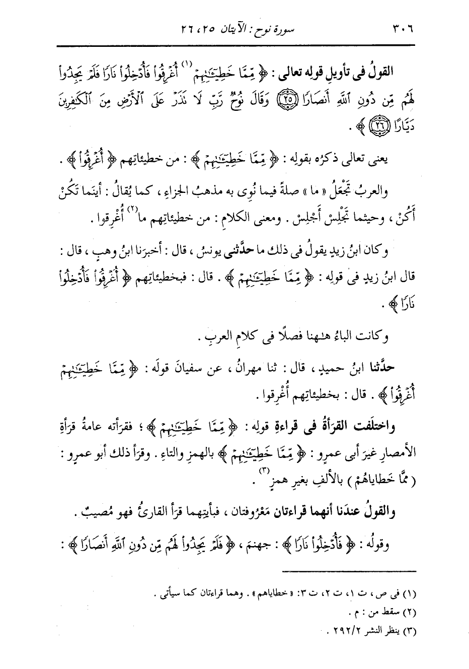 حَدَّثَنَا ابْنُ حُمَيْدٍ، قَالَ: ثنا مِهْرَانُ، عَنْ سُفْيَانَ، قَوْلُهُ: {§مِمَّا خَطِيئَاتِهِمْ أُغْرِقُوا} [نوح: 25] قَالَ: بِخَطِيئَاتِهِمْ أُغْرِقُوا وَاخْتَلَفَتِ الْقُرَّاءُ فِي قِرَاءَةِ قَوْلِهِ: {مِمَّا خَطِيئَاتِهِمْ} [نوح: 25] فَقَرَأَتْهُ عَامَّةُ قُرَّاءِ الْأَمْصَارِ غَيْرَ أَبِي عَمْرٍو {مِمَّا خَطِيئَاتِهِمْ} [نوح: 25] بِالْهَمْزِ وَالتَّاءِ، وَقَرَأَ ذَلِكَ أَبُو عَمْرٍو: (مِمَّا خَطَايَاهُمْ) بِالْأَلِفِ بِغَيْرِ هَمْزٍ. وَالْقَوْلُ عِنْدَنَا أَنَّهُمَا قِرَاءَتَانِ مَعْرُوفَتَانِ، فَبِأَيَّتِهِمَا قَرَأَ الْقَارِئُ فَهُوَ مُصِيبٌ