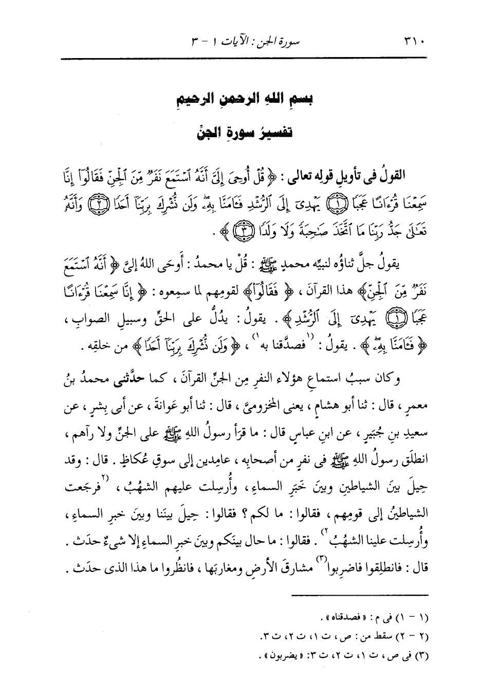 كَمَا: حَدَّثَنِي مُحَمَّدُ بْنُ مَعْمَرٍ، قَالَ: ثنا أَبُو هِشَامٍ، يَعْنِي الْمَخْزُومِيَّ، قَالَ: ثنا أَبُو عَوَانَةَ، عَنْ أَبِي بِشْرٍ، عَنْ سَعِيدِ بْنِ جُبَيْرٍ، عَنِ ابْنِ عَبَّاسٍ، قَالَ: مَا قَرَأَ رَسُولُ اللَّهِ صَلَّى اللهُ عَلَيْهِ وَسَلَّمَ عَلَى الْجِنِّ وَلَا رَآهُمْ؛ انْطَلَقَ رَسُولُ اللَّهِ صَلَّى اللهُ عَلَيْهِ وَسَلَّمَ فِي نَفَرٍ مِنْ أَصْحَابِهِ، عَامِدِينَ إِلَى سُوقِ عُكَاظٍ، قَالَ: وَقَدْ §حِيلَ بَيْنَ الشَّيَاطِينِ وَبَيْنَ خَبَرِ السَّمَاءِ، وَأُرْسِلَتْ عَلَيْهِمُ الشُّهُبُ، فَرَجَعَتِ الشَّيَاطِينُ إِلَى قَوْمِهِمْ، فَقَالُوا: مَا لَكُمْ؟ فَقَالُوا: حِيلَ بَيْنَنَا وَبَيْنَ خَبَرِ السَّمَاءِ، وَأُرْسِلَتْ عَلَيْنَا الشُّهُبُ، فَقَالُوا: مَا حَالَ بَيْنَكُمْ وَبَيْنَ خَبَرِ السَّمَاءِ إِلَّا شَيْءٌ حَدَثَ، قَالَ: فَانْطَلِقُوا فَاضْرِبُوا مَشَارِقَ الْأَرْضِ وَمَغَارِبَهَا فَانْظُرُوا مَا هَذَا الَّذِي حَدَثَ، -[311]- قَالَ: فَانْطَلَقُوا يَضْرِبُونَ مَشَارِقَ الْأَرْضِ وَمَغَارِبَهَا، يَتَتَبَّعُونَ مَا هَذَا الَّذِي حَالَ بَيْنَهُمْ وَبَيْنَ خَبَرِ السَّمَاءِ؛ قَالَ: فَانْطَلَقَ النَّفَرُ الَّذِينَ تَوَجَّهُوا نَحْوَ تِهَامَةَ إِلَى رَسُولِ اللَّهِ صَلَّى اللهُ عَلَيْهِ وَسَلَّمَ بِنَخْلَةَ، وَهُوَ عَامِدٌ إِلَى سُوقِ عُكَاظٍ، وَهُوَ يُصَلِّي بِأَصْحَابِهِ صَلَاةَ الْفَجْرِ؛ قَالَ: فَلَمَّا سَمِعُوا الْقُرْآنَ اسْتَمَعُوا لَهُ فَقَالُوا: هَذَا وَاللَّهِ الَّذِي حَالَ بَيْنَكُمْ وَبَيْنَ خَبَرِ السَّمَاءِ؛ قَالَ: فَهُنَالِكَ حِينَ رَجَعُوا إِلَى قَوْمِهِمْ، فَقَالُوا: يَا قَوْمَنَا {إِنَّا سَمِعْنَا قُرْآنًا عَجَبًا يَهْدِي إِلَى الرُّشْدِ فَآمَنَّا بِهِ وَلَنْ نُشْرِكَ بِرَبِّنَا أَحَدًا} [الجن: 2] قَالَ: فَأَنْزَلَ اللَّهُ عَلَى نَبِيِّهِ صَلَّى اللهُ عَلَيْهِ وَسَلَّمَ: {قُلْ أُوحِيَ إِلَيَّ أَنَّهُ اسْتَمَعَ نَفَرٌ مِنَ الْجِنِّ} [الجن: 1] وَإِنَّمَا أُوحِيَ إِلَيْهِ قَوْلُ الْجِنِّ