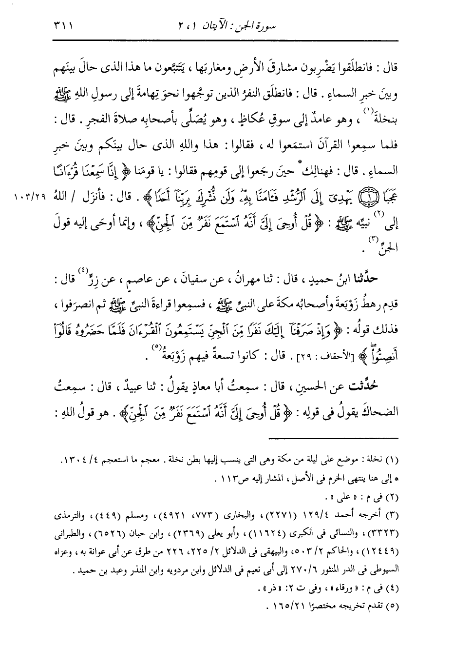 حَدَّثَنَا ابْنُ حُمَيْدٍ، قَالَ: ثنا مِهْرَانُ، عَنْ سُفْيَانَ، عَنْ عَاصِمٍ، عَنْ وَرْقَاءَ، قَالَ: §قَدِمَ رَهْطُ زَوْبَعَةَ وَأَصْحَابُهُ مَكَّةَ عَلَى النَّبِيِّ صَلَّى اللهُ عَلَيْهِ وَسَلَّمَ فَسَمِعُوا قِرَاءَةَ النَّبِيِّ صَلَّى اللهُ عَلَيْهِ وَسَلَّمَ ثُمَّ انْصَرَفُوا، فَذَلِكَ قَوْلُهُ: {وَإِذْ صَرَفْنَا إِلَيْكَ نَفَرًا مِنَ الْجِنِّ يَسْتَمِعُونَ الْقُرْآنَ فَلَمَّا حَضَرُوهُ قَالُوا أَنْصِتُوا} [الأحقاف: 29] قَالَ: كَانُوا تِسْعَةً فِيهِمْ زَوْبَعَةُ