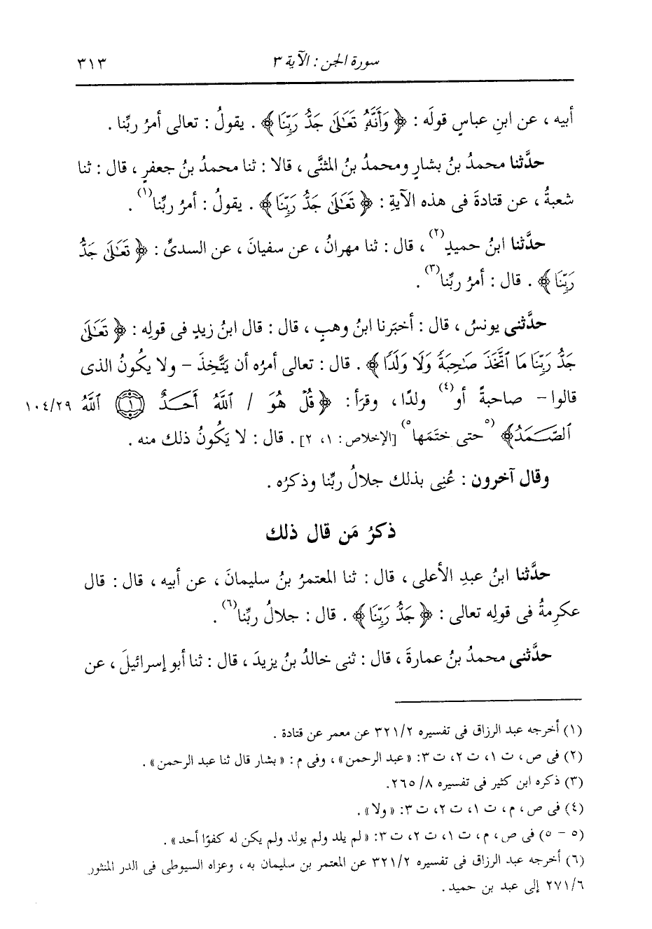 حَدَّثَنَا مُحَمَّدُ بْنُ بَشَّارٍ وَمُحَمَّدُ بْنُ الْمُثَنَّى، قَالَا: ثنا مُحَمَّدُ بْنُ جَعْفَرٍ، قَالَ: ثنا شُعْبَةُ، عَنْ قَتَادَةَ، فِي هَذِهِ الْآيَةِ: {§تَعَالَى جَدُّ رَبِّنَا} [الجن: 3] قَالَ: أَمْرُ رَبِّنَا