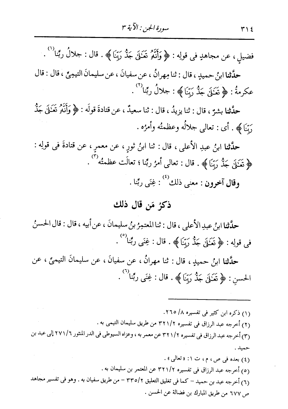 حَدَّثَنَا ابْنُ حُمَيْدٍ، قَالَ: ثنا مِهْرَانُ، عَنْ سُفْيَانَ، عَنْ سُلَيْمَانَ التَّيْمِيِّ، عَنِ الْحَسَنِ {§تَعَالَى جَدُّ رَبِّنَا} [الجن: 3] قَالَ: غِنَى رَبِّنَا