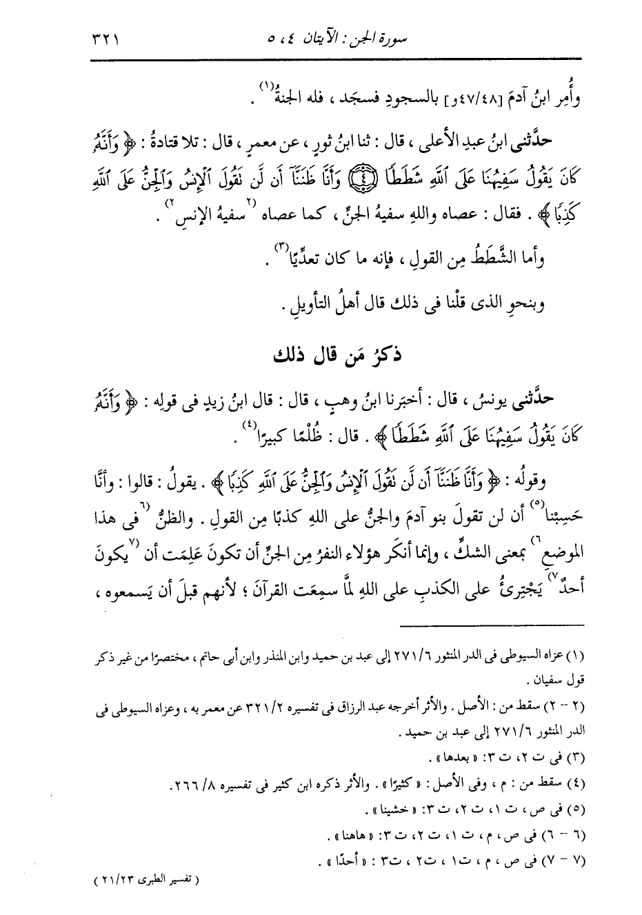 حَدَّثَنِي ابْنُ عَبْدِ الْأَعْلَى، قَالَ: ثنا ابْنُ ثَوْرٍ، عَنْ مَعْمَرٍ، قَالَ: تَلَا قَتَادَةُ: {§وَأَنَّهُ كَانَ يَقُولُ سَفِيهُنَا عَلَى اللَّهِ شَطَطًا وَأَنَّا ظَنَنَّا أَنْ لَنْ تَقُولُ الْإِنْسُ وَالْجِنُّ عَلَى اللَّهِ كَذِبًا} [الجن: 5] فَقَالَ: عَصَاهُ وَاللَّهِ سَفِيهُ الْجِنِّ، كَمَا عَصَاهُ سَفِيهُ الْإِنْسِ وَأَمَّا الشَّطَطُ مِنَ الْقَوْلِ، فَإِنَّهُ مَا كَانَ تَعَدِّيًا. وَبِنَحْوِ الَّذِي قُلْنَا فِي ذَلِكَ قَالَ أَهْلُ التَّأْوِيلِ