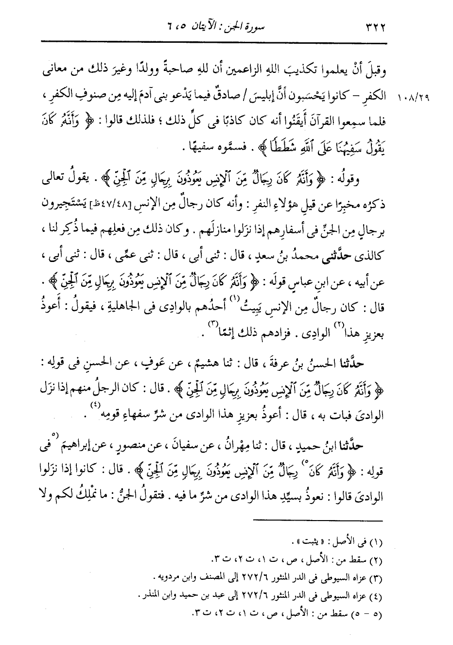 حَدَّثَنَا الْحَسَنُ بْنُ عَرَفَةَ، قَالَ: ثنا هُشَيْمٌ، عَنْ عَوْفٍ، عَنِ الْحَسَنِ، فِي قَوْلِهِ: {وَأَنَّهُ كَانَ §رِجَالٌ مِنَ الْإِنْسِ يَعُوذُونَ بِرِجَالٍ مِنَ الْجِنِّ} [الجن: 6] قَالَ: كَانَ الرَّجُلُ مِنْهُمْ إِذَا نَزَلَ الْوَادِي فَبَاتَ بِهِ، قَالَ: أَعُوذُ بِعَزِيزِ هَذَا الْوَادِي مِنْ شَرِّ سُفَهَاءِ قَوْمِهِ