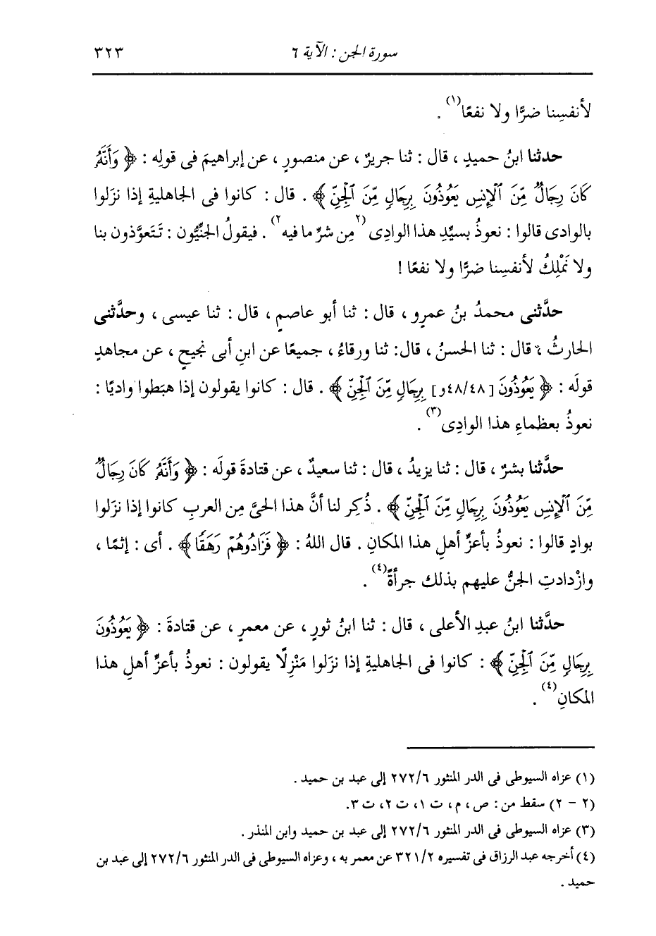 قَالَ: ثنا جَرِيرٌ، عَنْ مَنْصُورٍ، عَنْ إِبْرَاهِيمَ، فِي قَوْلِهِ: {وَأَنَّهُ كَانَ رِجَالٌ مِنَ الْإِنْسِ يَعُوذُونَ بِرِجَالٍ مِنَ الْجِنِّ} [الجن: 6] قَالَ: كَانُوا فِي الْجَاهِلِيَّةِ إِذَا نَزَلُوا بِالْوَادِي قَالُوا: §نَعُوذُ بِسَيِّدِ هَذَا الْوَادِي، فَيَقُولُ الْجِنِّيُّونَ: تَتَعَوَّذُونَ بِنَا وَلَا نَمْلِكُ لِأَنْفُسِنَا ضَرًّا وَلَا نَفْعًا