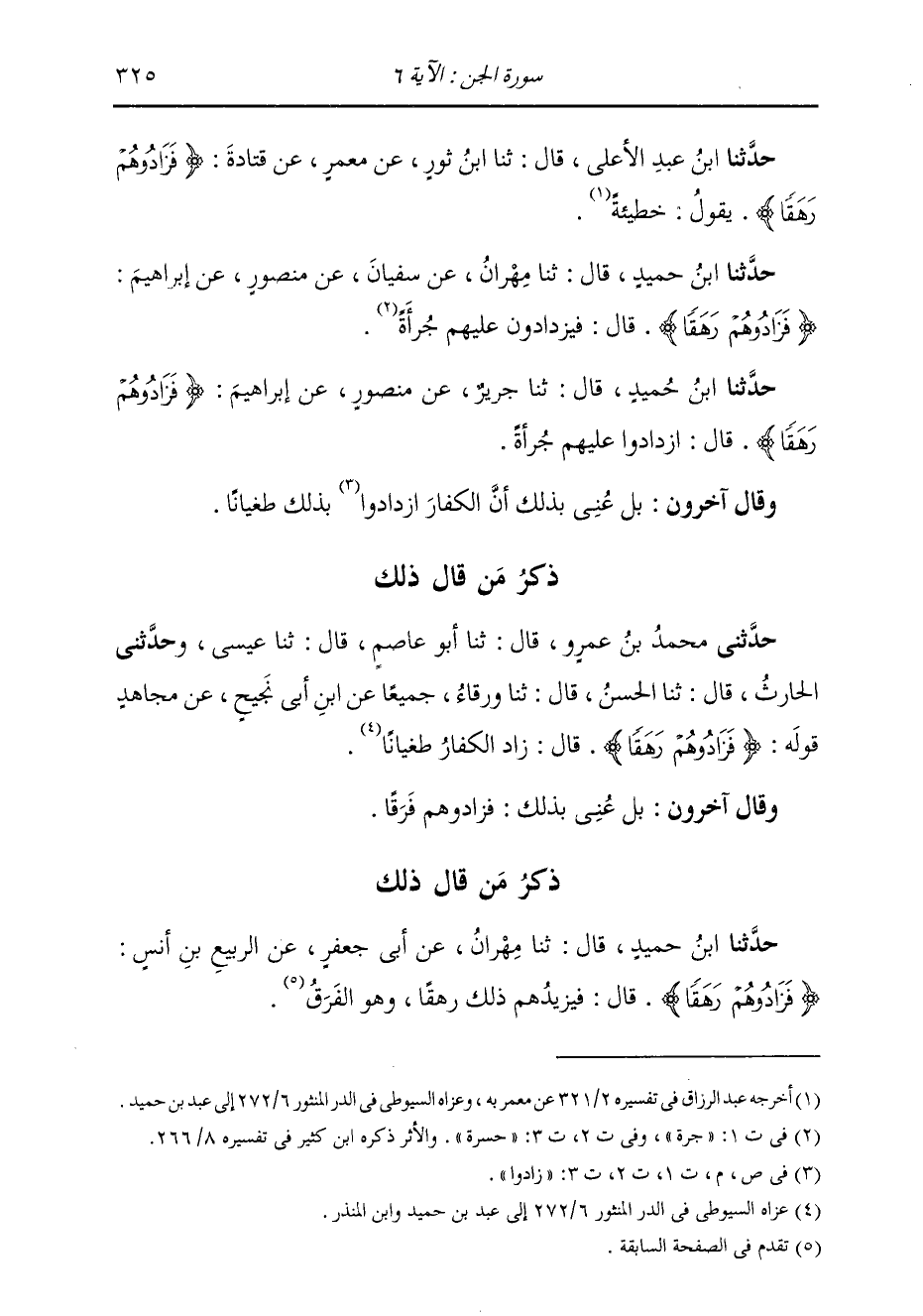 قَالَ ثنا جَرِيرٌ، عَنْ مَنْصُورٍ، عَنْ إِبْرَاهِيمَ {§فَزَادُوهُمْ رَهَقًا} [الجن: 6] قَالَ: ازْدَادُوا عَلَيْهِمْ جَرَاءَةً وَقَالَ آخَرُونَ: بَلْ عُنِيَ بِذَلِكَ أَنَّ الْكُفَّارَ زَادُوا بِذَلِكَ طُغْيَانًا