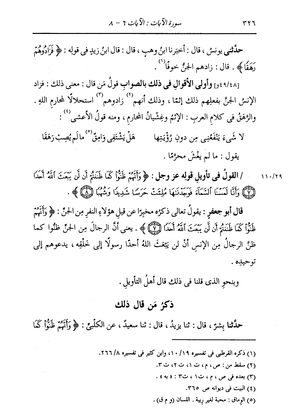 حَدَّثَنِي يُونُسُ، قَالَ: أَخْبَرَنَا ابْنُ وَهْبٍ، قَالَ: قَالَ ابْنُ زَيْدٍ، فِي قَوْلِهِ: {§فَزَادُوهُمْ رَهَقًا} [الجن: 6] قَالَ: زَادَهُمُ الْجِنُّ خَوْفًا وَأَوْلَى الْأَقْوَالِ فِي ذَلِكَ بِالصَّوَابِ قَوْلُ مَنْ قَالَ: مَعْنَى ذَلِكَ: فَزَادَ الْإِنْسَ الْجِنُّ بِفِعْلِهِمْ ذَلِكَ إِثْمًا، وَذَلِكَ زَادُوهُمْ بِهِ اسْتِحْلَالًا لِمَحَارِمِ اللَّهِ. وَالرَّهَقُ فِي كَلَامِ الْعَرَبِ: الْإِثْمُ وَغَشَيَانُ الْمَحَارِمِ؛ وَمِنْهُ قَوْلُ الْأَعْشَى: