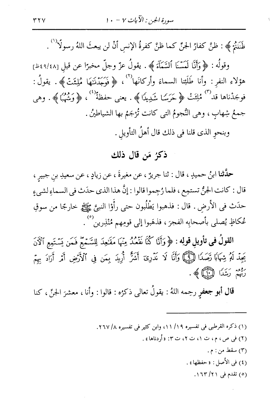 ذِكْرُ مَنْ قَالَ ذَلِكَ حَدَّثَنَا ابْنُ حُمَيْدٍ، قَالَ: ثنا جَرِيرٌ، عَنْ مُغِيرَةَ، عَنْ زِيَادٍ، عَنْ سَعِيدِ بْنِ جُبَيْرٍ، قَالَ: كَانَتِ §الْجِنُّ تَسْتَمِعُ، فَلَمَّا رُجِمُوا قَالُوا: إِنَّ هَذَا الَّذِي حَدَثَ فِي السَّمَاءِ لِشَيْءٍ حَدَثَ فِي الْأَرْضِ؛ قَالَ: فَذَهَبُوا يَطْلُبُونَ حَتَّى رَأَوُا النَّبِيَّ صَلَّى اللهُ عَلَيْهِ وَسَلَّمَ خَارِجًا مِنْ سُوقِ عُكَاظٍ يُصَلِّي بِأَصْحَابِهِ الْفَجْرَ، فَذَهَبُوا إِلَى قَوْمِهِمْ مُنْذِرِينَ