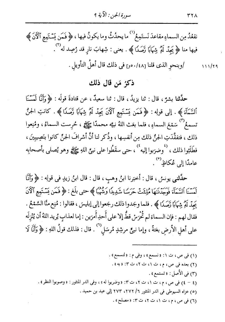 ذِكْرُ مَنْ قَالَ ذَلِكَ حَدَّثَنَا بِشْرٌ، قَالَ: ثنا يَزِيدُ، قَالَ: ثنا سَعِيدٌ، عَنْ قَتَادَةَ، قَوْلُهُ: {وَأَنَّا لَمَسْنَا السَّمَاءَ} [الجن: 8] إِلَى قَوْلُهُ: {فَمَنْ يَسْتَمِعِ الْآنَ يَجِدْ لَهُ شَهَابًا رَصَدًا} [الجن: 9] كَانَتِ §الْجِنُّ تَسْمَعُ سَمْعَ السَّمَاءِ؛ فَلَمَّا بَعَثَ اللَّهُ نَبِيَّهُ، حُرِسَتِ السَّمَاءُ، وَمُنِعُوا ذَلِكَ، فَتَفَقَّدَتِ الْجِنُّ ذَلِكَ مِنْ أَنْفُسِهَا وَذُكِرَ لَنَا أَنَّ أَشْرَافَ الْجِنِّ كَانُوا بِنَصِيبِينَ، فَطَلَبُوا ذَلِكَ، وَضَرَبُوا لَهُ حَتَّى سَقَطُوا عَلَى نَبِيِّ اللَّهِ صَلَّى اللهُ عَلَيْهِ وَسَلَّمَ وَهُو يُصَلِّي بِأَصْحَابِهِ عَامِدًا إِلَى عُكَاظٍ