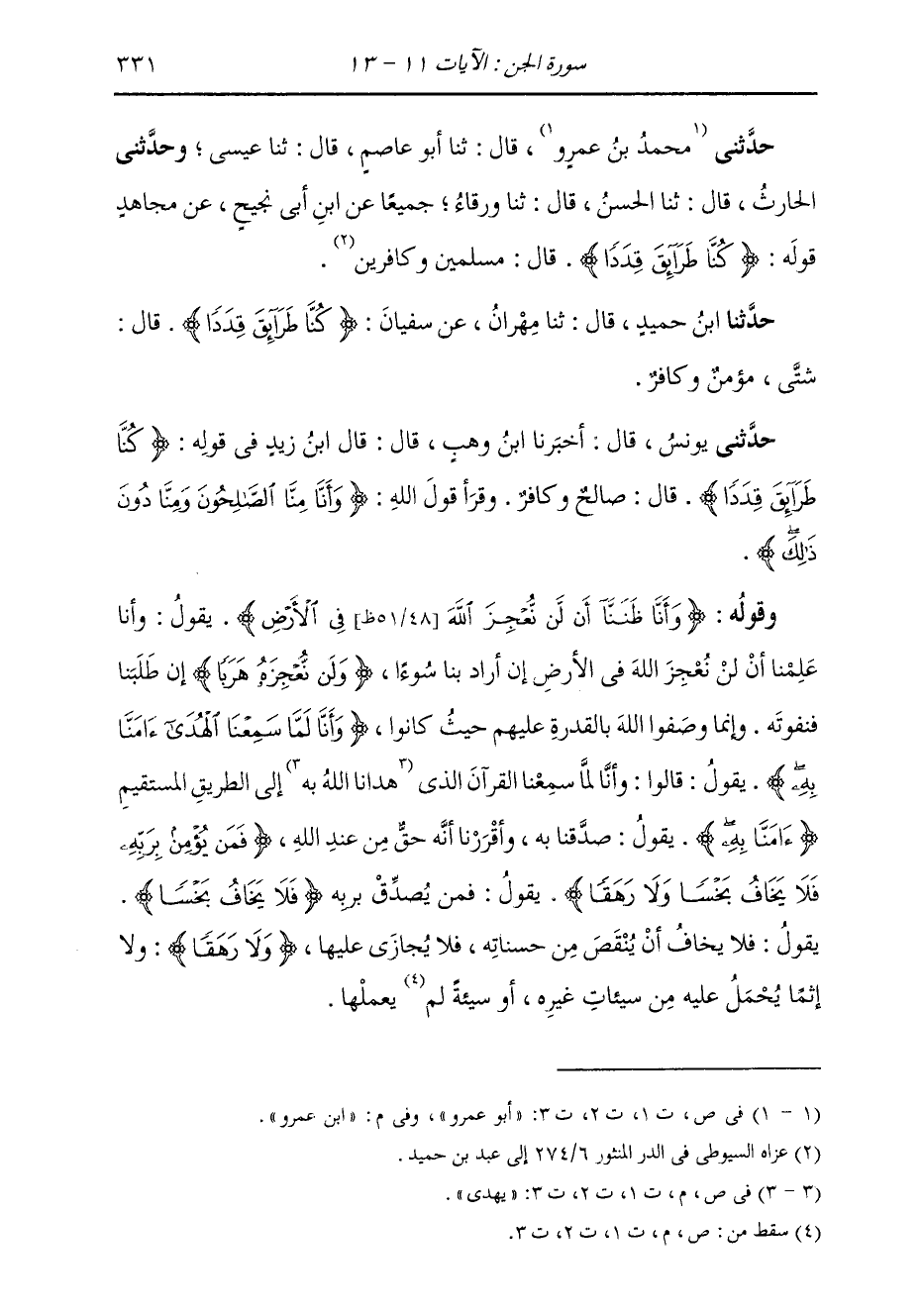 حَدَّثَنِي ابْنُ عَمْرٍو، قَالَ: ثنا أَبُو عَاصِمٍ، قَالَ: ثنا عِيسَى، وَحَدَّثَنِي الْحَارِثُ، قَالَ: ثنا الْحَسَنُ، قَالَ: ثنا وَرْقَاءُ، جَمِيعًا عَنِ ابْنِ أَبِي نَجِيحٍ، عَنْ مُجَاهِدٍ، فِي قَوْلِهِ: {§كُنَّا طَرَائِقَ قِدَدًا} [الجن: 11] قَالَ: مُسْلِمِينَ وَكَافِرِينَ