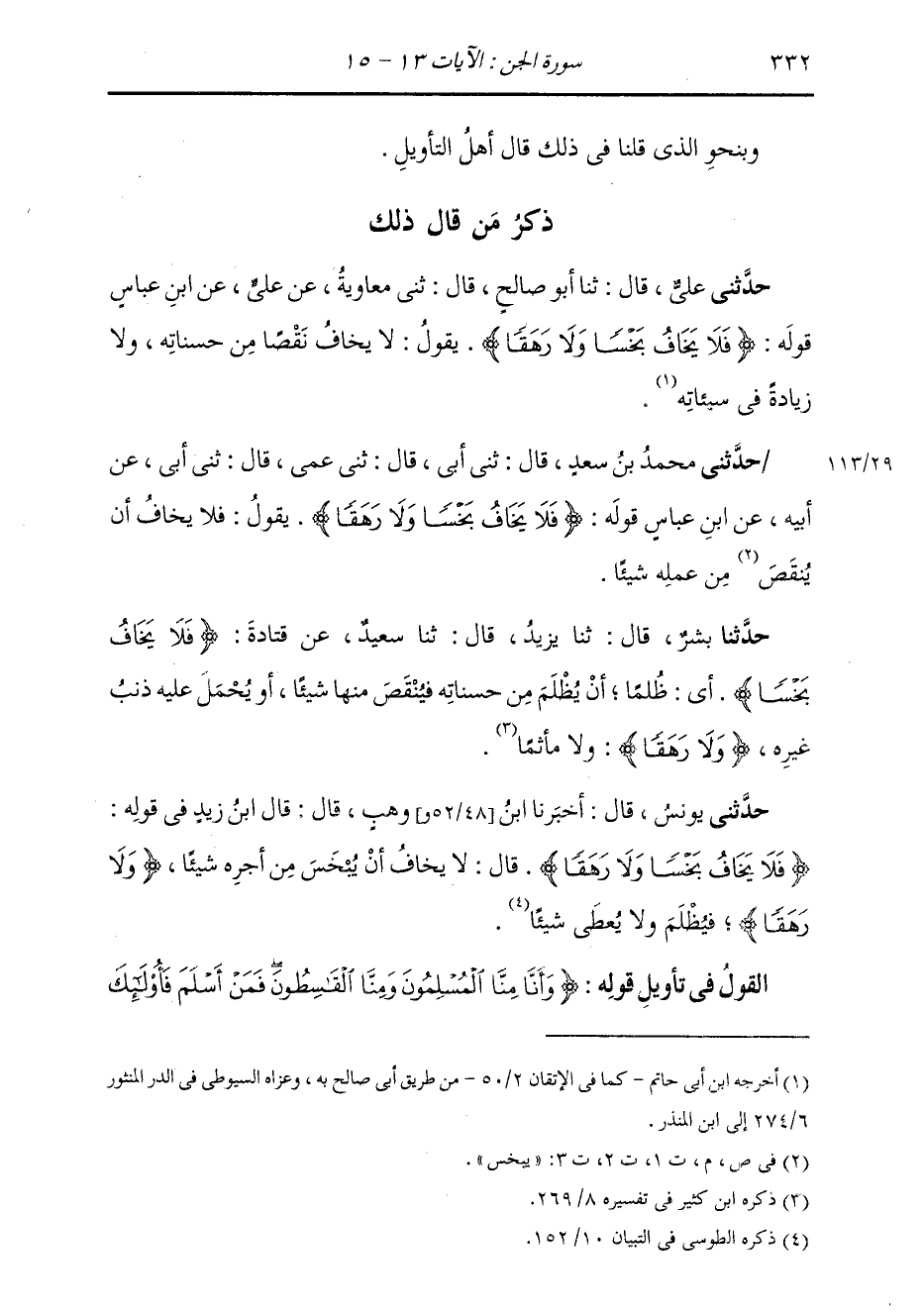 ذِكْرُ مَنْ قَالَ ذَلِكَ حَدَّثَنِي عَلِيٌّ، قَالَ: ثنا أَبُو صَالِحٍ، قَالَ: ثني مُعَاوِيَةُ، عَنْ عَلِيٍّ، عَنِ ابْنِ عَبَّاسٍ، قَوْلُهُ: {§فَلَا يَخَافُ بَخْسًا وَلَا رَهَقًا} [الجن: 13] يَقُولُ: لَا يَخَافُ نَقْصًا مِنْ حَسَنَاتِهِ، وَلَا زِيَادَةً فِي سَيِّئَاتِهِ