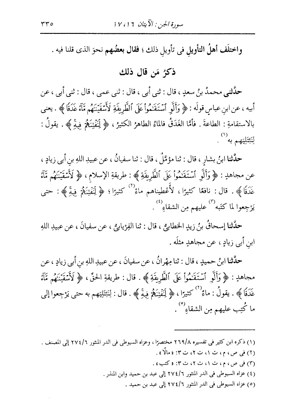 حَدَّثَنَا ابْنُ بَشَّارٍ، قَالَ: ثنا مُؤَمَّلٌ، قَالَ: ثنا سُفْيَانُ، عَنْ عُبَيْدِ اللَّهِ بْنِ أَبِي زِيَادٍ، عَنْ مُجَاهِدٍ، {§وَأَنْ لَوِ اسْتَقَامُوا عَلَى الطَّرِيقَةِ} طَرِيقَةِ الْإِسْلَامِ {لَأَسْقَيْنَاهُمْ مَاءً غَدَقًا} [الجن: 16] . قَالَ: نَافِعًا كَثِيرًا، لَأَعْطَيْنَاهُمْ مَالًا كَثِيرًا {لِنَفْتِنَهُمْ فِيهِ} [الجن: 17] حَتَّى يَرْجِعُوا لِمَا كُتِبَ عَلَيْهِمْ مِنَ الشَّقَاءِ. حَدَّثَنَا إِسْحَاقُ بْنُ زَيْدٍ الْخَطَّابِيُّ، قَالَ: ثنا الْفِرْيَابِيُّ، عَنْ سُفْيَانَ، عَنْ عُبَيْدِ اللَّهِ بْنِ أَبِي زِيَادٍ، عَنْ مُجَاهِدٍ مِثْلَهُ