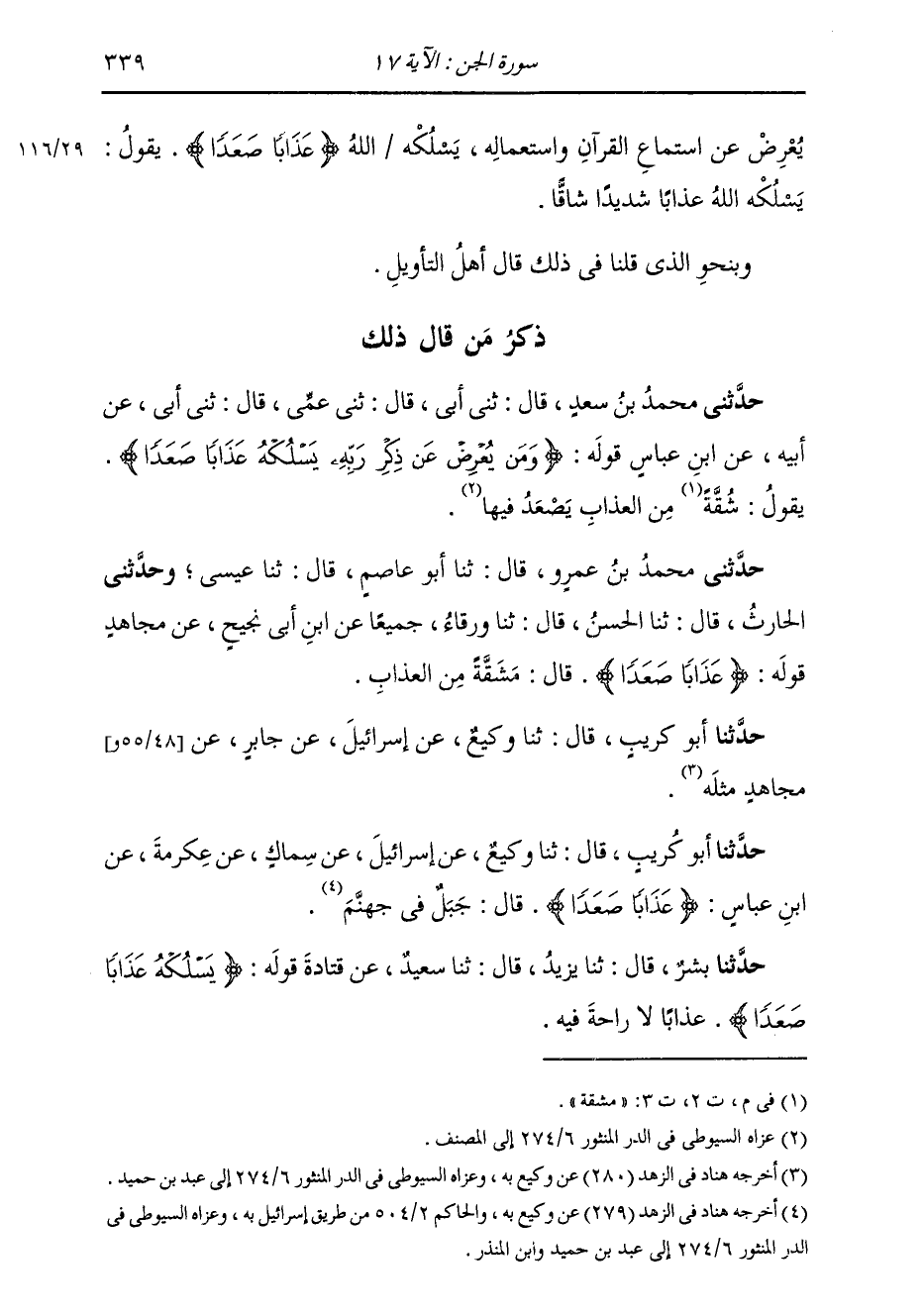 حَدَّثَنِي مُحَمَّدُ بْنُ عَمْرٍو، قَالَ: ثني أَبُو عَاصِمٍ، قَالَ: ثنا عِيسَى، وَحَدَّثَنِي الْحَارِثُ، قَالَ: ثنا الْحَسَنُ، قَالَ: ثنا وَرْقَاءُ، جَمِيعًا عَنِ ابْنِ أَبِي نَجِيحٍ، عَنْ مُجَاهِدٍ، قَوْلُهُ: {§عَذَابًا صَعَدًا} [الجن: 17] قَالَ: مَشَقَّةً مِنَ الْعَذَابِ. حَدَّثَنَا أَبُو كُرَيْبٍ، قَالَ: ثنا وَكِيعٌ، عَنْ إِسْرَائِيلَ، عَنْ جَابِرٍ، عَنْ مُجَاهِدٍ، مِثْلَهُ