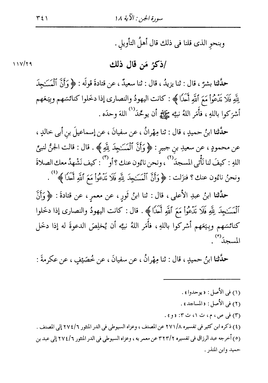 ذِكْرُ مَنْ قَالَ ذَلِكَ حَدَّثَنَا بِشْرٌ، قَالَ: ثنا يَزِيدُ، قَالَ: ثنا سَعِيدٌ، عَنْ قَتَادَةَ، قَوْلُهُ: {§وَأَنَّ الْمَسَاجِدَ لِلَّهِ فَلَا تَدْعُوا مَعَ اللَّهِ أَحَدًا} [الجن: 18] كَانَتِ الْيَهُودُ وَالنَّصَارَى إِذَا دَخَلُوا كَنَائِسَهُمْ وَبِيَعَهُمْ أَشْرَكُوا بِاللَّهِ، فَأَمَرَ اللَّهُ نَبِيَّهُ أَنْ يُوَحِّدَ اللَّهَ وَحْدَهُ