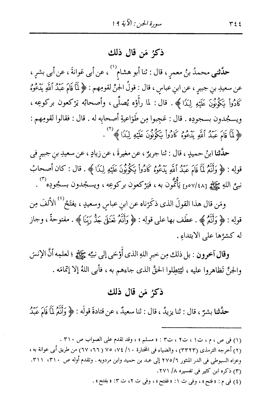حَدَّثَنَا ابْنُ حُمَيْدٍ، قَالَ: ثنا جَرِيرٌ، عَنْ مُغِيرَةَ، عَنْ زِيَادٍ، عَنْ سَعِيدِ بْنِ جُبَيْرٍ، فِي قَوْلِهِ: {§وَأَنَّهُ لَمَّا قَامَ عَبْدُ اللَّهِ يَدْعُوهُ كَادُوا يَكُونُونَ عَلَيْهِ لِبَدًا} [الجن: 19] قَالَ: كَانَ أَصْحَابُ نَبِيِّ اللَّهِ صَلَّى اللهُ عَلَيْهِ وَسَلَّمَ يَأْتَمُّونَ بِهِ، فَيَرْكَعُونَ بِرُكُوعِهِ، وَيَسْجُدُونَ بِسُجُودِهِ وَمَنْ قَالَ هَذَا الْقَوْلَ الَّذِي ذَكَرْنَاهُ عَنِ ابْنِ عَبَّاسٍ وَسَعِيدٍ فَتَحَ الْأَلِفَ مِنْ قَوْلِهِ: {وَأَنَّهُ} [الجن: 19] عَطْفٌ بِهَا عَلَى قَوْلِهِ: {وَأَنَّهُ تَعَالَى جَدُّ رَبِّنَا} [الجن: 3] مَفْتُوحَةً، وَجَازَ لَهُ كَسْرُهَا عَلَى الِابْتِدَاءِ. وَقَالَ آخَرُونَ: بَلْ ذَلِكَ مِنْ خَبَرِ اللَّهِ الَّذِي أَوْحَاهُ إِلَى نَبِيِّهِ صَلَّى اللهُ عَلَيْهِ وَسَلَّمَ لَعِلْمِهِ أَنَّ الْإِنْسَ وَالْجِنَّ تَظَاهَرُوا عَلَيْهِ، لِيُبْطِلُوا الْحَقَّ الَّذِي جَاءَهُمْ بِهِ، فَأَبَى اللَّهُ إِلَّا إِتْمَامَهُ