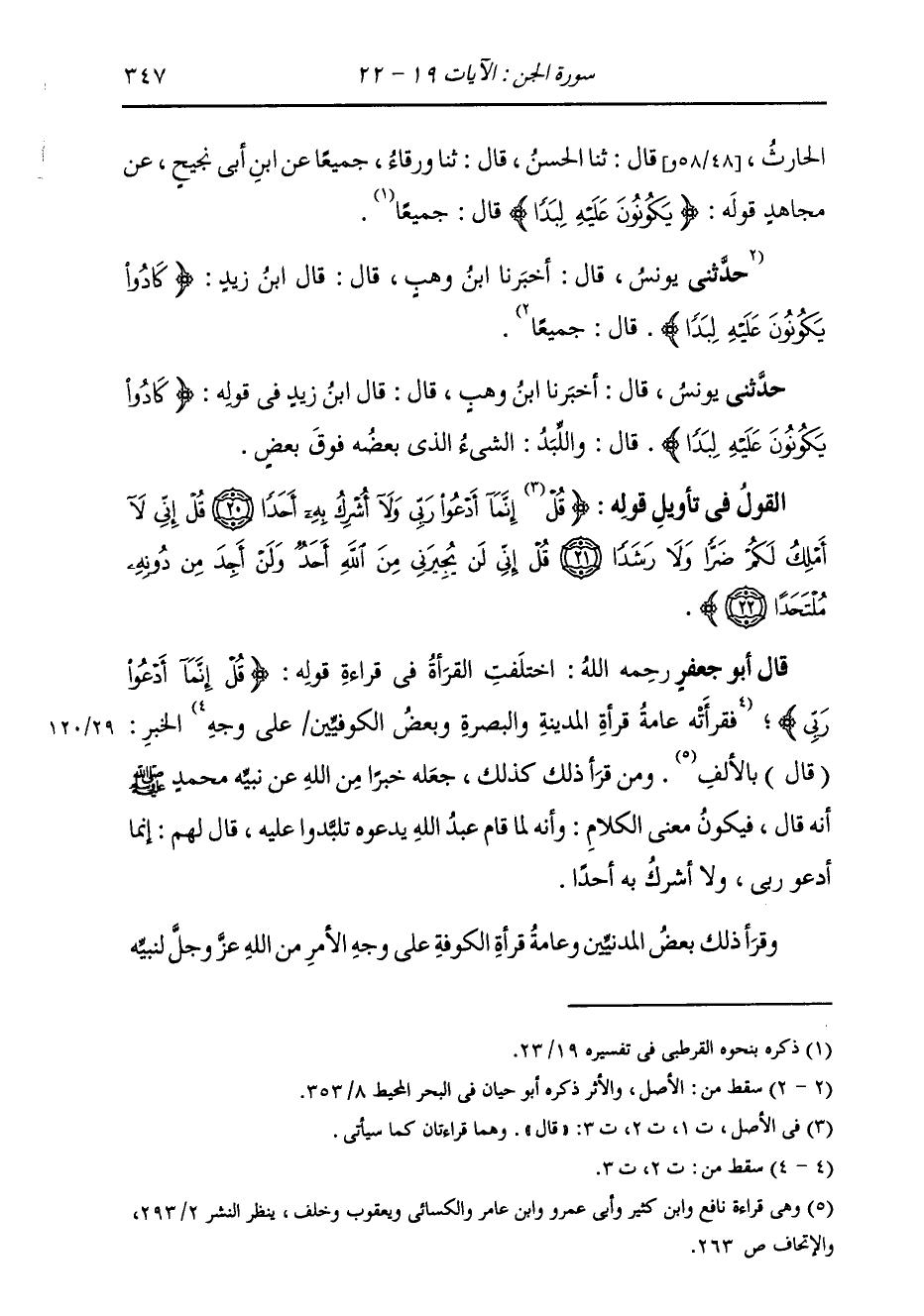 §الْقَوْلُ فِي تَأْوِيلِ قَوْلِهِ تَعَالَى: {قُلْ إِنَّمَا أَدْعُو رَبِّي وَلَا أُشْرِكُ بِهِ أَحَدًا قُلْ إِنِّي لَا أَمْلِكُ لَكُمْ ضَرًّا وَلَا رَشَدًا قُلْ إِنِّي لَنْ يُجِيرَنِي مِنَ اللَّهِ أَحَدٌ وَلَنْ أَجِدَ مِنْ دُونِهِ مُلْتَحَدًا} [الجن: 21] اخْتَلَفَتِ الْقُرَّاءُ فِي قِرَاءَةِ قَوْلِهِ: {قُلْ إِنَّمَا أَدْعُو رَبِّي} [الجن: 20] فَقَرَأَتْهُ عَامَّةُ قُرَّاءِ الْمَدِينَةِ وَالْبَصْرَةِ وَبَعْضُ الْكُوفِيِّينَ عَلَى وَجْهِ الْخَبَرِ وَقَالَ بِالْأَلِفِ؛ وَمَنْ قَرَأَ ذَلِكَ كَذَلِكَ، جَعَلَهُ خَبَرًا مِنَ اللَّهِ عَنْ نَبِيِّهِ مُحَمَّدٍ صَلَّى اللهُ عَلَيْهِ وَسَلَّمَ أَنَّهُ قَالَ، فَيَكُونُ مَعْنَى الْكَلَامِ: وَأَنَّهُ لَمَّا قَامَ عَبْدُ اللَّهِ يَدْعُوهُ تَلَبَّدُوا عَلَيْهِ، قَالَ لَهُمْ: {إِنَّمَا أَدْعُو رَبِّي وَلَا أُشْرِكُ بِهِ أَحَدًا} [الجن: 20] . وَقَرَأَ ذَلِكَ بَعْضُ الْمَدَنِيِّينَ وَعَامَّةُ قُرَّاءِ الْكُوفَةِ عَلَى وَجْهِ الْأَمْرِ مِنَ اللَّهِ عَزَّ وَجَلَّ لِنَبِيِّهِ صَلَّى اللهُ عَلَيْهِ وَسَلَّمَ: