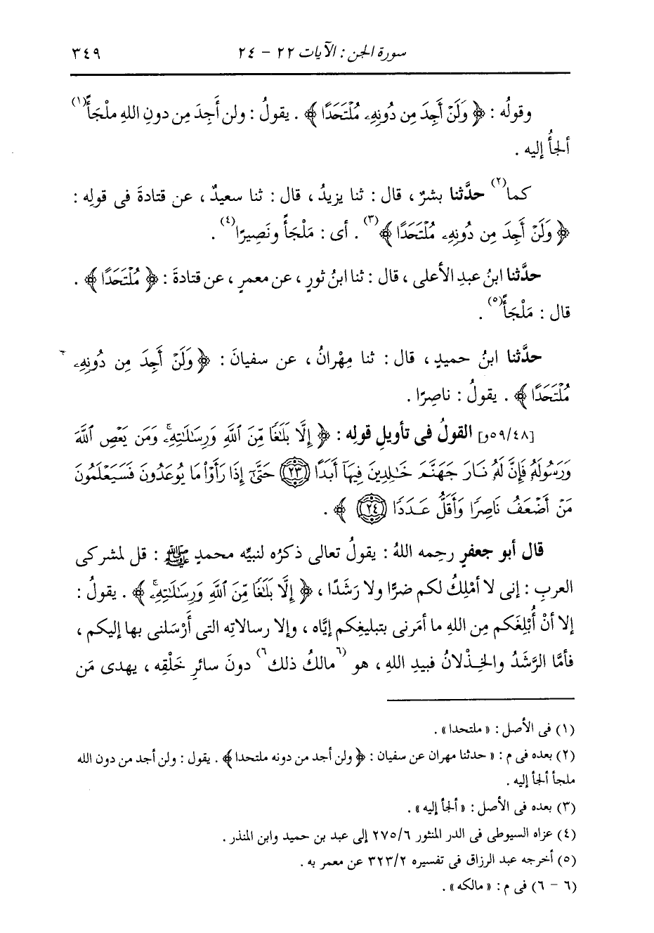 حَدَّثَنَا ابْنُ حُمَيْدٍ، قَالَ: ثنا مِهْرَانُ، عَنْ سُفْيَانَ {§وَلَنْ أَجِدَ مِنْ دُونِهِ مُلْتَحَدًا} [الجن: 22] يَقُولُ: نَاصِرًا