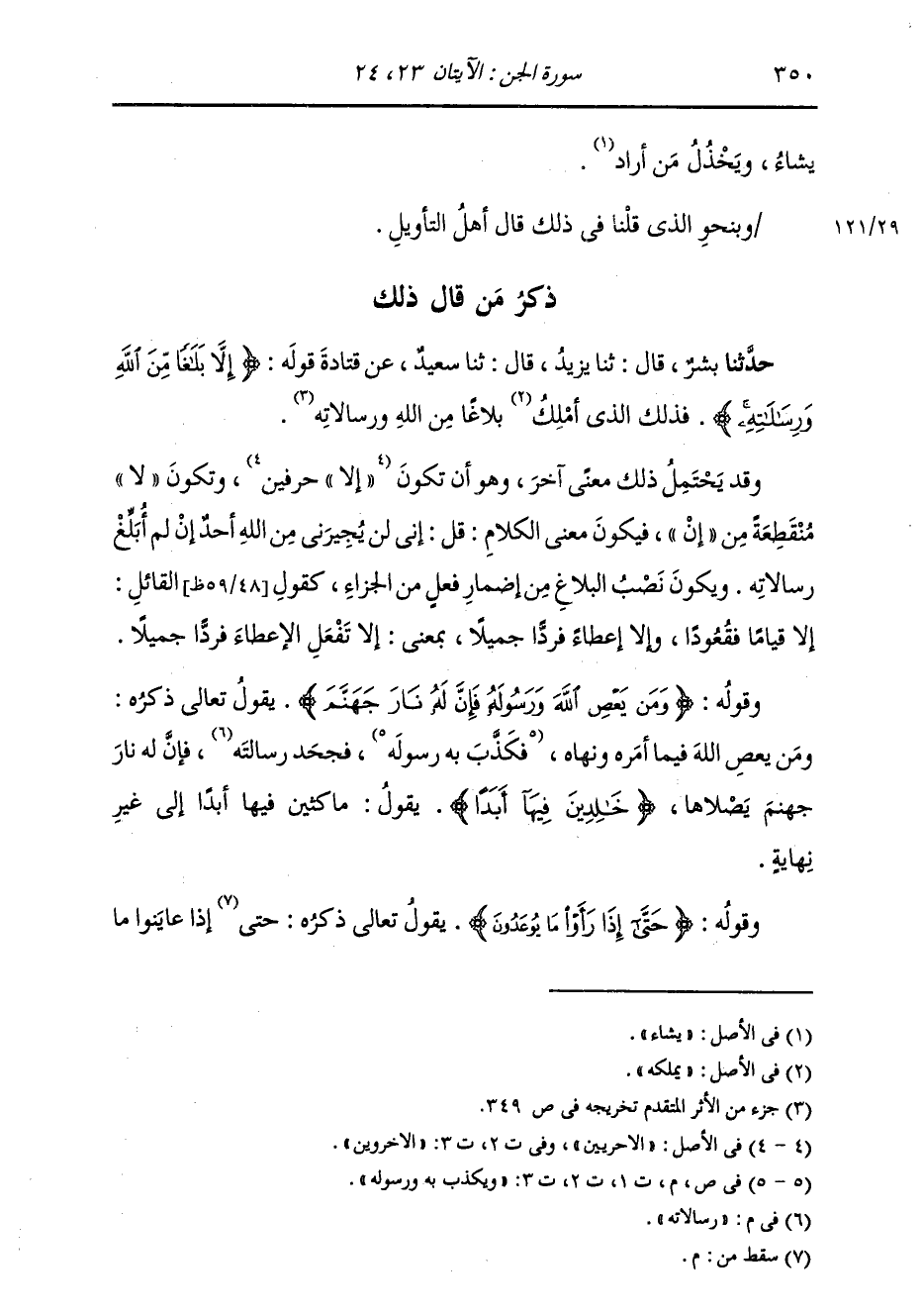 ذِكْرُ مَنْ قَالَ ذَلِكَ حَدَّثَنَا بِشْرٌ، قَالَ: ثنا يَزِيدُ، قَالَ: ثنا سَعِيدٌ، عَنْ قَتَادَةَ، قَوْلُهُ: {§إِلَّا بَلَاغًا مِنَ اللَّهِ وَرِسَالَاتِهِ} [الجن: 23] فَذَلِكَ الَّذِي أَمْلِكُ بَلَاغًا مِنَ اللَّهِ وَرِسَالَاتِهِ وَقَدْ يَحْتَمِلُ ذَلِكَ مَعْنًى آخَرَ، وَهُوَ أَنْ تَكُونَ إِلَّا حَرْفَيْنِ، وَتَكُونَ لَا مُنْقَطِعَةً مِنْ إِنْ فَيَكُونَ مَعْنَى الْكَلَامِ: قُلْ إِنِّي لَنْ يُجِيرَنِي مِنَ اللَّهِ أَحَدٌ إِنْ لَمْ أُبَلِّغْ رِسَالَاتِهِ؛ وَيَكُونَ نَصْبُ الْبَلَاغِ مِنْ إِضْمَارِ فِعْلٍ مِنَ الْجَزَاءِ كَقَوْلِ الْقَائِلِ: إِنْ لَا قِيَامًا فَقُعُودًا، وَإِنْ لَا إِعْطَاءً فَرَدًّا جَمِيلًا، بِمَعْنَى: إِنْ لَا تَفْعَلِ الْإِعْطَاءَ فَرَدًّا جَمِيلًا