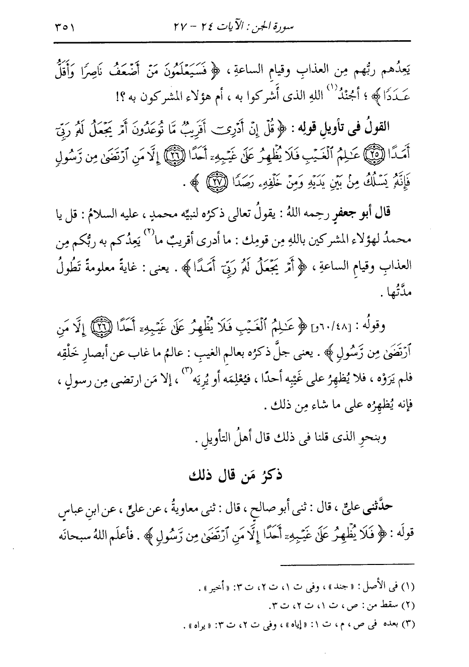 §وَقَوْلُهُ: {عَالِمُ الْغَيْبِ فَلَا يُظْهِرُ عَلَى غَيْبِهِ أَحَدًا إِلَّا مَنِ ارْتَضَى مِنْ رَسُولٍ} [الجن: 27] يَعْنِي بِعَالِمِ الْغَيْبِ: عَالِمِ مَا غَابَ عَنْ أَبْصَارِ خَلْقِهِ، فَلَمْ يَرَوْهُ فَلَا يُظْهِرُ عَلَى غَيْبِهِ أَحَدًا، فَيُعْلِمُهُ أَوْ يُرِيهِ إِيَّاهُ {إِلَّا مَنِ ارْتَضَى مِنْ رَسُولٍ} [الجن: 27] ، فَإِنَّهُ يُظْهِرُهُ عَلَى مَا شَاءَ مِنْ ذَلِكَ. وَبِنَحْوِ الَّذِي قُلْنَا فِي ذَلِكَ قَالَ أَهْلُ التَّأْوِيلِ.