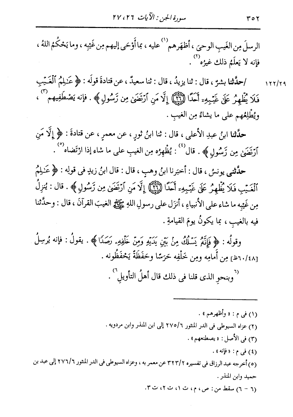 حَدَّثَنَا ابْنُ عَبْدِ الْأَعْلَى، قَالَ: ثنا ابْنُ ثَوْرٍ، عَنْ مَعْمَرٍ، عَنْ قَتَادَةَ {§إِلَّا مَنِ ارْتَضَى مِنْ رَسُولٍ} [الجن: 27] فَإِنَّهُ يُظْهِرُهُ مِنَ الْغَيْبِ عَلَى مَا شَاءَ إِذَا ارْتَضَاهُ