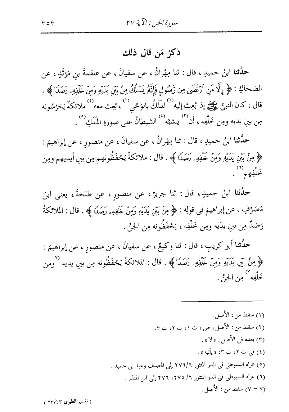 ذِكْرُ مَنْ قَالَ ذَلِكَ حَدَّثَنَا ابْنُ حُمَيْدٍ، قَالَ: ثنا مِهْرَانُ، عَنْ سُفْيَانَ، عَنْ عَلْقَمَةَ بْنِ مَرْثَدٍ، عَنِ الضَّحَّاكِ، {§إِلَّا مَنِ ارْتَضَى مِنْ رَسُولٍ فَإِنَّهُ يَسْلُكُ مِنْ بَيْنِ يَدَيْهِ وَمِنْ خَلْفِهِ رَصَدًا} [الجن: 27] قَالَ كَانَ النَّبِيُّ صَلَّى اللهُ عَلَيْهِ وَسَلَّمَ إِذَا بُعِثَ إِلَيْهِ الْمَلَكُ بِالْوَحْيِ بُعِثَ مَعَهُ مَلَائِكَةٌ يَحْرُسُونَهُ مِنْ بَيْنِ يَدَيْهِ وَمِنْ خَلْفِهِ، أَنْ يَتَشَبَّهَ الشَّيْطَانُ عَلَى صُورَةِ الْمَلَكِ