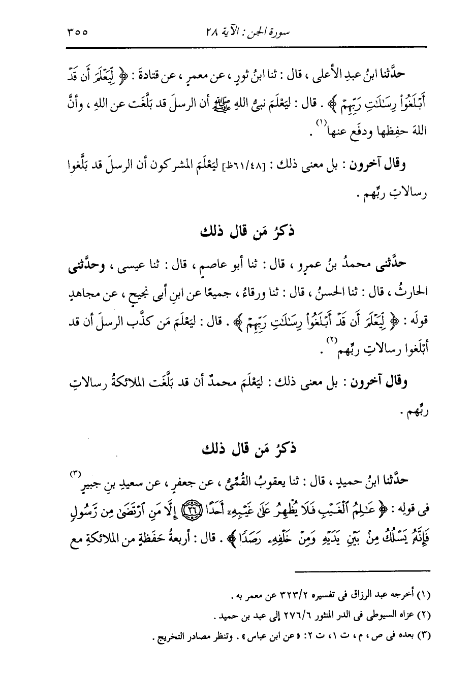 ذِكْرُ مَنْ قَالَ ذَلِكَ حَدَّثَنَا ابْنُ حُمَيْدٍ، قَالَ: ثنا يَعْقُوبُ، عَنْ جَعْفَرٍ، عَنْ سَعِيدِ بْنِ جُبَيْرٍ، عَنِ ابْنِ عَبَّاسٍ، فِي قَوْلِهِ: {§عَالِمُ الْغَيْبِ فَلَا يُظْهِرُ عَلَى غَيْبِهِ أَحَدًا إِلَّا مَنِ ارْتَضَى مِنْ رَسُولٍ فَإِنَّهُ يَسْلُكُ مِنْ بَيْنِ يَدَيْهِ وَمِنْ خَلْفِهِ رَصَدًا} [الجن: 27] قَالَ: أَرْبَعَةُ حَفَظَةٍ مِنَ الْمَلَائِكَةَ مَعَ -[356]- جِبْرَائِيلَ {لِيَعْلَمَ} [الجن: 28] مُحَمَّدٌ {أَنْ قَدْ أَبْلَغُوا رِسَالَاتِ رَبِّهِمْ وَأَحَاطَ بِمَا لَدَيْهِمْ وَأَحْصَى كُلَّ شَيْءٍ عَدَدًا} [الجن: 28] قَالَ: وَمَا نَزَلَ جِبْرِيلُ عَلَيْهِ السَّلَامُ بِشَيْءٍ مِنَ الْوَحْي إِلَّا وَمَعَهُ أَرْبَعَةُ حَفَظَةٍ قَالَ أَبُو جَعْفَرٍ: وَأَوْلَى هَذِهِ الْأَقْوَالِ عِنْدَنَا بِالصَّوَابِ، قَوْلُ مَنْ قَالَ: لِيَعْلَمَ الرَّسُولُ أَنَّ الرُّسُلَ قَبْلَهُ قَدْ أَبْلَغُوا رِسَالَاتِ رَبِّهِمْ؛ وَذَلِكَ أَنَّ قَوْلَهُ: {لِيَعْلَمَ} [الجن: 28] مِنْ سَبَبِ قَوْلِهِ: {فَإِنَّهُ يَسْلُكُ مِنْ بَيْنِ يَدَيْهِ وَمِنْ خَلْفِهِ رَصَدًا} [الجن: 27] وَذَلِكَ خَبَرٌ عَنِ الرَّسُولِ، فَمَعْلُومٌ بِذَلِكَ أَنَّ قَوْلَهُ لِيَعْلَمَ مِنْ سَبَبِهِ إِذْ كَانَ ذَلِكَ خَبَرًا عَنْهُ