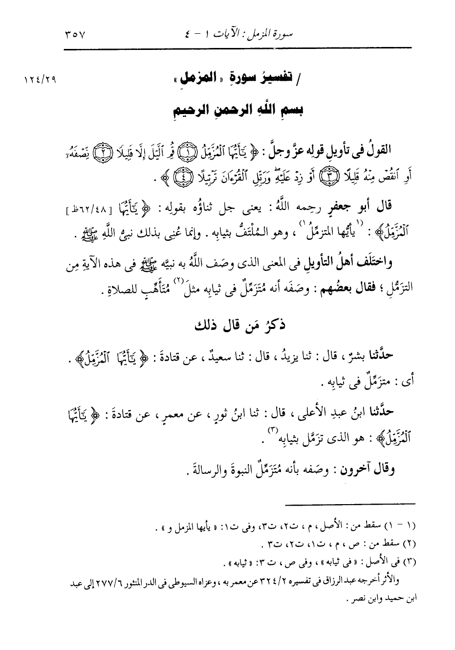 ذِكْرُ مَنْ قَالَ ذَلِكَ حَدَّثَنَا بِشْرٌ، قَالَ: ثنا يَزِيدُ، قَالَ: ثنا سَعِيدٌ، عَنْ قَتَادَةَ: {§يَا أَيُّهَا الْمُزَّمِّلُ} [المزمل: 1] أَيِ الْمُتَزَمِّلُ فِي ثِيَابِهِ