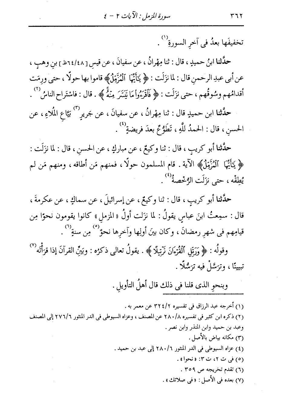 حَدَّثَنَا ابْنُ حُمَيْدٍ، قَالَ: ثنا مِهْرَانُ، عَنْ سُفْيَانَ، عَنْ قَيْسِ بْنِ وَهْبٍ، عَنْ أَبِي عَبْدِ الرَّحْمَنِ، قَالَ: لَمَّا نَزَلَتْ: {يَا أَيُّهَا الْمُزَّمِّلُ} [المزمل: 1] §قَامُوا بِهَا حَوْلًا حَتَّى وَرِمَتْ أَقْدَامُهُمْ وَسُوقُهُمْ حَتَّى نَزَلَتْ: {فَاقْرَءُوا مَا تَيَسَّرَ مِنْهُ} فَاسْتَرَاحَ النَّاسُ