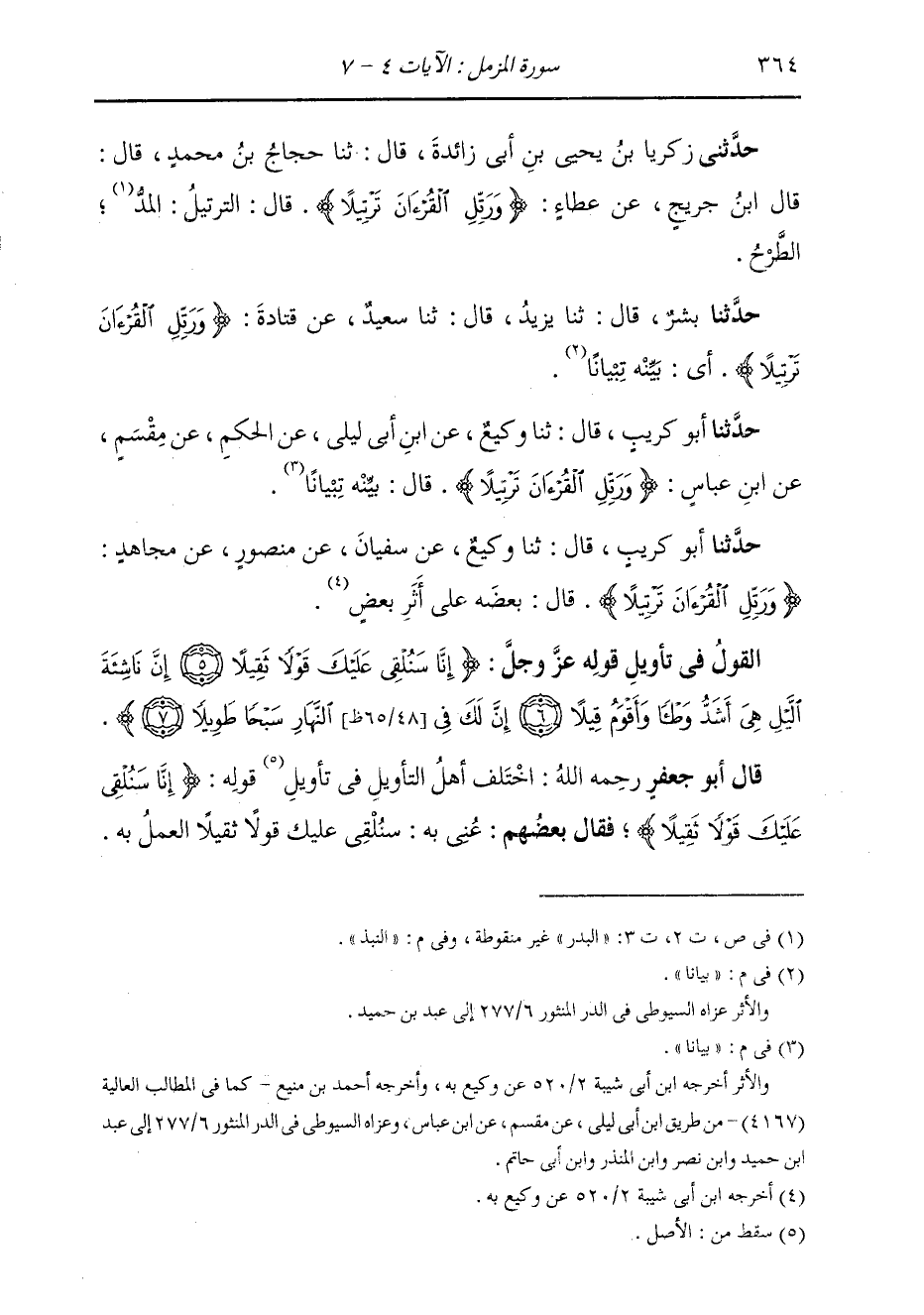 حَدَّثَنِي زَكَرِيَّا بْنُ يَحْيَى بْنِ أَبِي زَائِدَةَ، قَالَ: ثنا حَجَّاجُ بْنُ مُحَمَّدٍ، قَالَ: قَالَ ابْنُ جُرَيْجٍ، عَنْ عَطَاءٍ، {§وَرَتِّلِ الْقُرْآنَ تَرْتِيلًا} [المزمل: 4] قَالَ: التَّرْتِيلُ النَّبْذُ: الطَّرْحُ