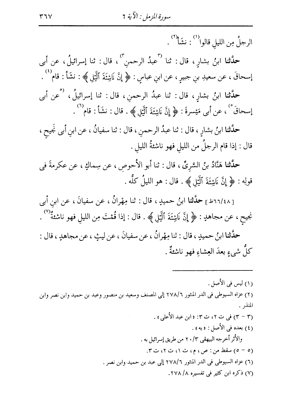 حَدَّثَنَا ابْنُ بَشَّارٍ، قَالَ: ثنا عَبْدُ الرَّحْمَنِ، قَالَ: ثنا إِسْرَائِيلُ، عَنْ أَبِي إِسْحَاقَ، عَنْ سَعِيدِ بْنِ جُبَيْرٍ، عَنِ ابْنِ عَبَّاسٍ {§إِنَّ نَاشِئَةَ اللَّيْلِ} [المزمل: 6] نَشَأَ: قَامَ