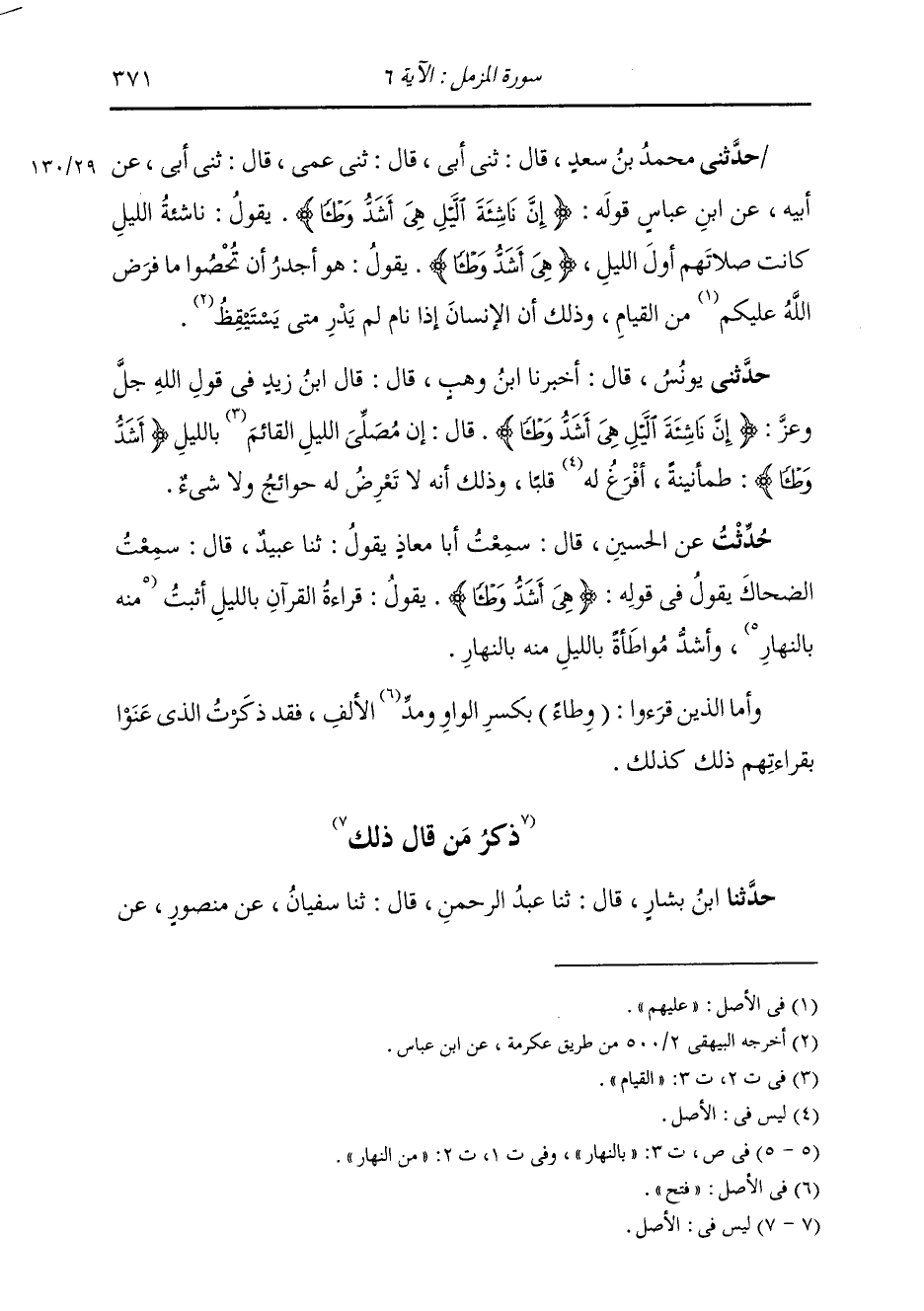 حَدَّثَنِي مُحَمَّدُ بْنُ سَعْدٍ، قَالَ: ثني أَبِي، قَالَ: ثني عَمِّي، قَالَ: ثني أَبِي، عَنْ أَبِيهِ، عَنِ ابْنِ عَبَّاسٍ، قَوْلُهُ: {§إِنَّ نَاشِئَةَ اللَّيْلِ هِيَ أَشَدُّ وَطْئًا} يَقُولُ: نَاشِئَةُ اللَّيْلِ كَانَتْ صَلَاتُهُمْ أَوَّلَ اللَّيْلِ {هِيَ أَشَدُّ وَطْئًا} يَقُولُ: هُوَ أَجْدَرُ أَنْ تُحْصُوا مَا فَرَضَ اللَّهُ عَلَيْكُمْ مِنَ الْقِيَامِ، وَذَلِكَ أَنَّ الْإِنْسَانَ إِذَا نَامَ لَمْ يَدْرِ مَتَى يَسْتَيْقِظُ
