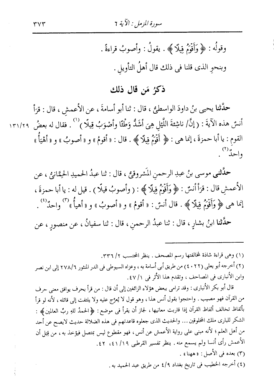 ذِكْرُ مَنْ قَالَ ذَلِكَ حَدَّثَنِي يَحْيَى بْنُ دَاوُدَ الْوَاسِطِيُّ، قَالَ: ثنا أَبُو أُسَامَةَ، عَنِ الْأَعْمَشِ، قَالَ: قَرَأَ أَنَسٌ هَذِهِ الْآيَةَ: «§إِنَّ نَاشِئَةَ اللَّيْلِ هِيَ أَشَدُّ وَطْئًا وَأَصْوَبُ قِيلًا» . فَقَالَ لَهُ بَعْضُ الْقَوْمِ: يَا أَبَا حَمْزَةَ، إِنَّمَا هِيَ {وَأَقْوَمُ قِيلًا} [المزمل: 6] قَالَ: أَقْوَمُ وَأَصْوَبُ وَأَهْيَأُ وَاحِدٌ