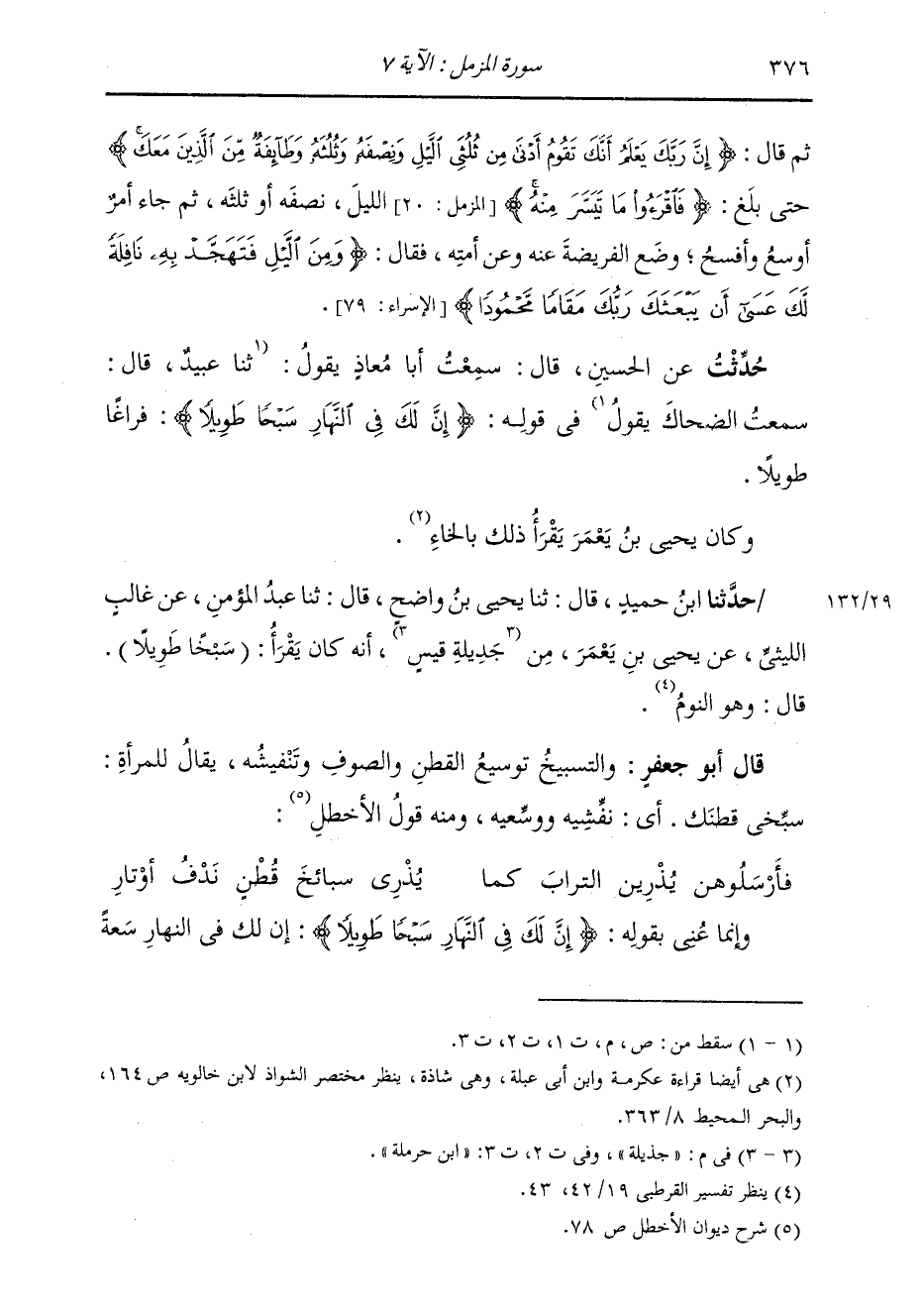 حَدَّثَنَا ابْنُ حُمَيْدٍ، قَالَ: ثنا يَحْيَى بْنُ وَاضِحٍ، قَالَ: ثنا عَبْدُ الْمُؤْمِنِ، عَنْ غَالِبٍ اللَّيْثِيِّ، عَنْ يَحْيَى بْنِ يَعْمُرَ، مِنْ جَذِيلَةِ قَيْسٍ أَنَّهُ كَانَ يَقْرَأُ: «§سَبْخًا طَوِيلًا» قَالَ: وَهُوَ النَّوْمُ قَالَ أَبُو جَعْفَرٍ: وَالتَّسْبِيخُ: تَوْسِيعُ الْقُطْنِ وَالصُّوفِ وَتَنْفِيشُهُ، يُقَالُ لِلْمَرْأَةِ: سَبِّخِي قُطْنَكِ: أَيْ نَفِّشِيهِ وَوَسِّعِيهِ؛ وَمِنْهُ قَوْلُ الْأَخْطَلِ: