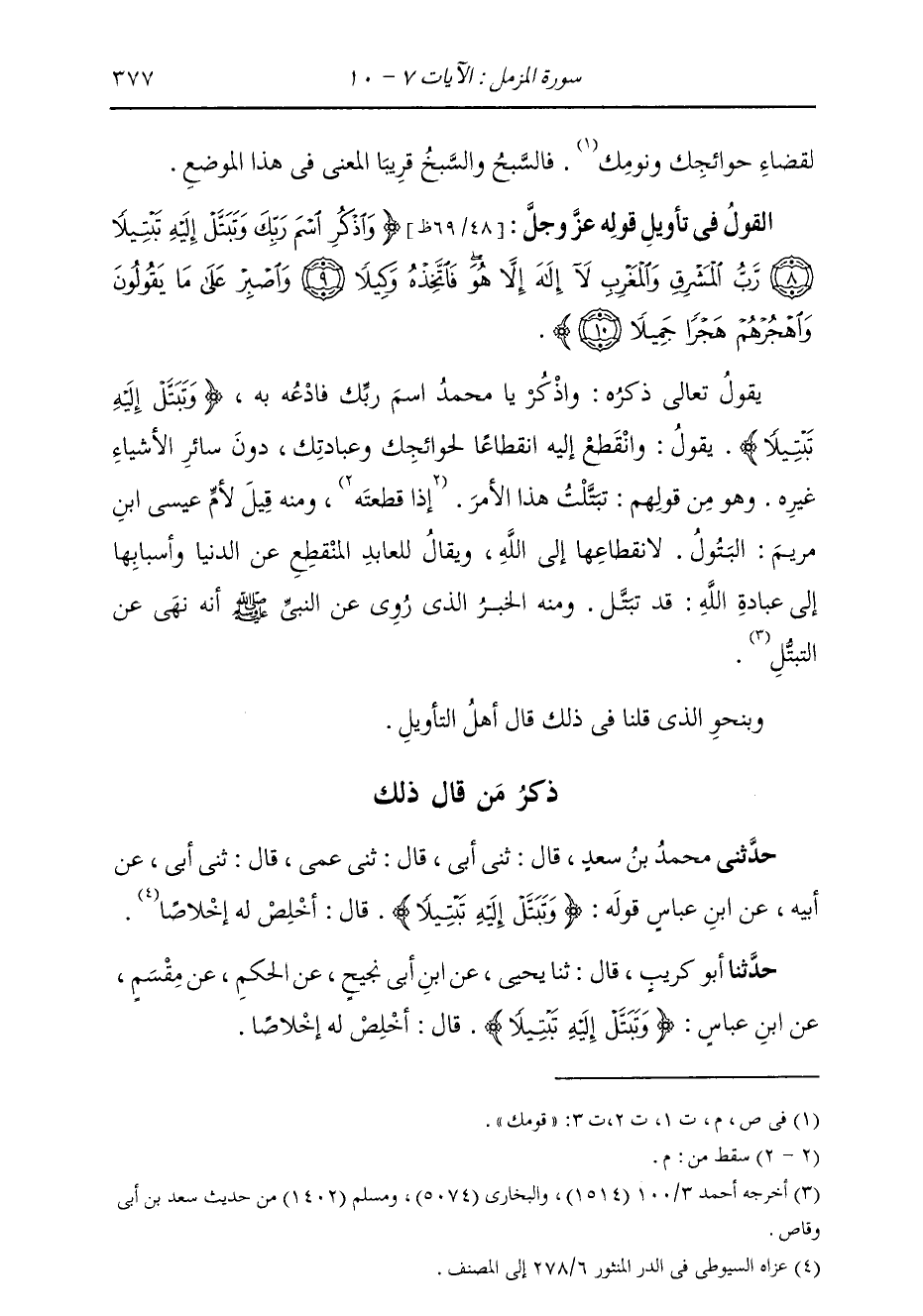 §الْقَوْلُ فِي تَأْوِيلِ قَوْلِهِ تَعَالَى {وَاذْكُرِ اسْمَ رَبِّكَ وَتَبَتَّلْ إِلَيْهِ تَبْتِيلًا رَبُّ الْمَشْرِقِ وَالْمَغْرِبِ لَا إِلَهَ إِلَّا هُوَ فَاتَّخِذْهُ وَكِيلًا وَاصْبِرْ عَلَى مَا يَقُولُونَ وَاهْجُرْهُمْ هَجْرًا جَمِيلًا} [المزمل: 9] يَقُولُ تَعَالَى ذِكْرُهُ: {وَاذْكُرْ} [آل عمران: 41] يَا مُحَمَّدُ {اسْمَ رَبِّكَ} [الرحمن: 78] فَادْعُهُ بِهِ. {وَتَبَتَّلْ إِلَيْهِ تَبْتِيلًا} [المزمل: 8] يَقُولُ: وَانْقَطِعْ إِلَيْهِ انْقِطَاعًا لِحَوَائِجِكَ وَعِبَادَتِكَ دُونَ سَائِرِ الْأَشْيَاءِ غَيْرِهِ؛ وَهُوَ مِنْ قَوْلِهِمْ: تَبَتَّلْتُ هَذَا الْأَمْرَ؛ وَمِنْهُ قِيلَ لِأُمِّ عِيسَى ابْنِ مَرْيَمَ الْبَتُولُ، لِانْقِطَاعِهَا إِلَى اللَّهِ؛ وَيُقَالُ لِلْعَابِدِ الْمُنْقَطِعِ عَنِ الدُّنْيَا وَأَسْبَابِهَا إِلَى عِبَادَةِ اللَّهِ: قَدْ تَبَتَّلَ؛ وَمِنْهُ الْخَبَرُ الَّذِي رُوِيَ عَنِ النَّبِيِّ صَلَّى اللهُ عَلَيْهِ وَسَلَّمَ: أَنَّهُ نَهَى عَنِ التَّبَتُّلِ. وَبِنَحْوِ الَّذِي قُلْنَا فِي ذَلِكَ قَالَ أَهْلُ التَّأْوِيلِ.