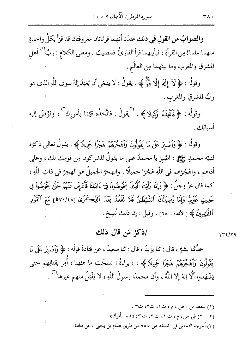ذِكْرُ مَنْ قَالَ ذَلِكَ حَدَّثَنَا بِشْرٌ، قَالَ: ثنا يَزِيدُ، قَالَ: ثنا سَعِيدٌ، عَنْ قَتَادَةَ، قَوْلُهُ: {§وَاصْبِرْ عَلَى مَا يَقُولُونَ وَاهْجُرْهُمْ هَجْرًا جَمِيلًا} [المزمل: 10] بَرَاءَةُ نَسَخَتْ مَا هَهُنَا؛ أُمِرَ بِقِتَالِهِمْ حَتَّى يَشْهَدُوا أَنْ لَا إِلَهَ إِلَّا اللَّهُ وَأَنَّ مُحَمَّدًا رَسُولُ اللَّهِ، لَا يَقْبَلُ مِنْهُمْ غَيْرَهَا