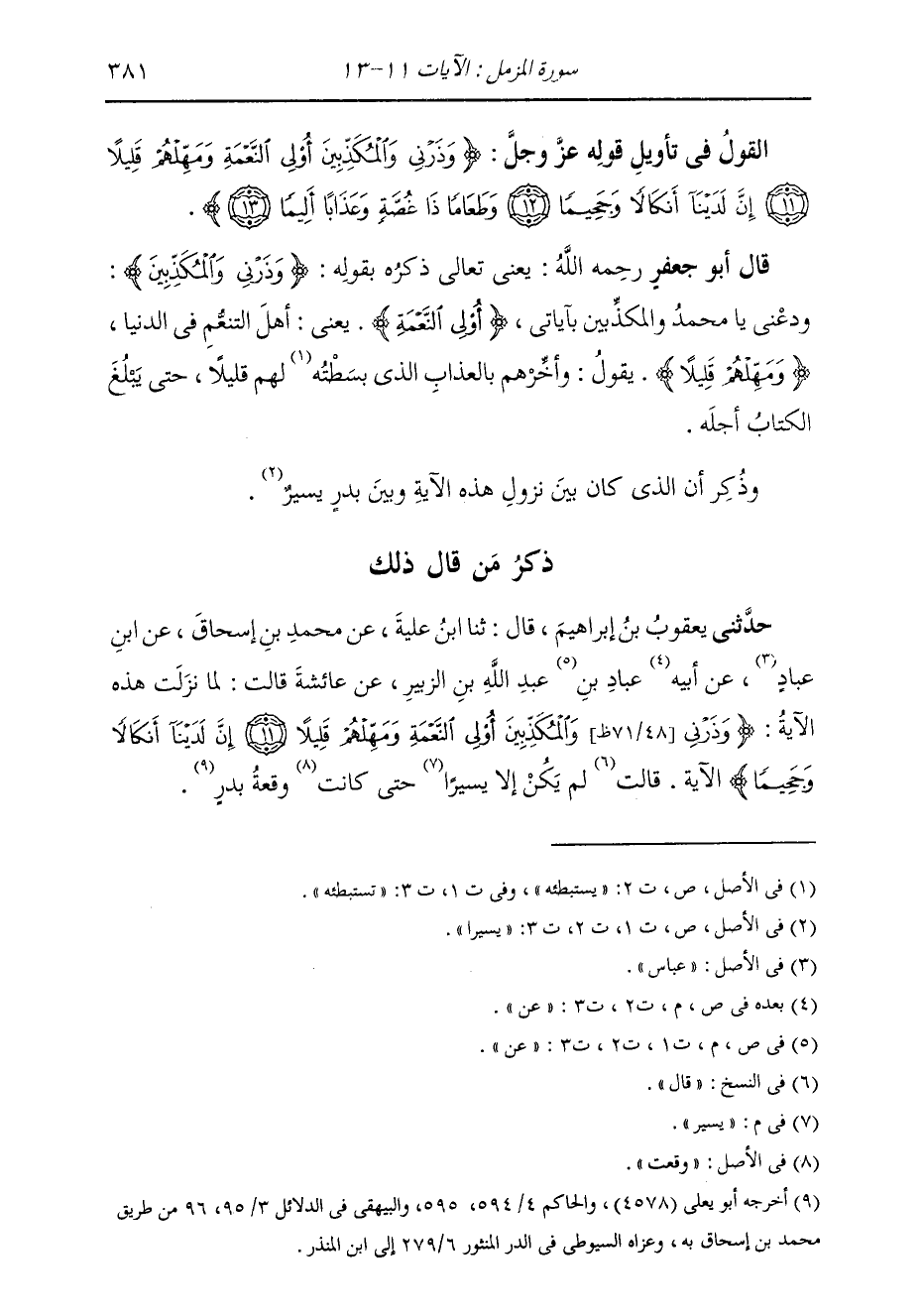 ذِكْرُ مَنْ قَالَ ذَلِكَ حَدَّثَنِي يَعْقُوبُ بْنُ إِبْرَاهِيمَ، قَالَ: ثنا ابْنُ عُلَيَّةَ، عَنْ مُحَمَّدِ بْنِ إِسْحَاقَ، عَنِ ابْنِ عَبَّادٍ، عَنْ أَبِيهِ، عَنْ عَبَّادٍ، عَنْ عَبْدِ اللَّهِ بْنِ الزُّبَيْرِ، عَنْ عَائِشَةَ، قَالَتْ: لَمَّا نَزَلَتْ هَذِهِ الْآيَةُ: {§وَذَرْنِي وَالْمُكَذِّبِينَ أُولِي النِّعْمَةِ وَمَهِّلْهُمْ قَلِيلًا إِنَّ لَدَيْنَا أَنْكَالًا وَجَحِيمًا} [المزمل: 12] الْآيَةُ، قَالَتْ: لَمْ يَكُنْ إِلَّا يَسِيرٌ حَتَّى كَانَتْ وَقْعَةُ بَدْرٍ